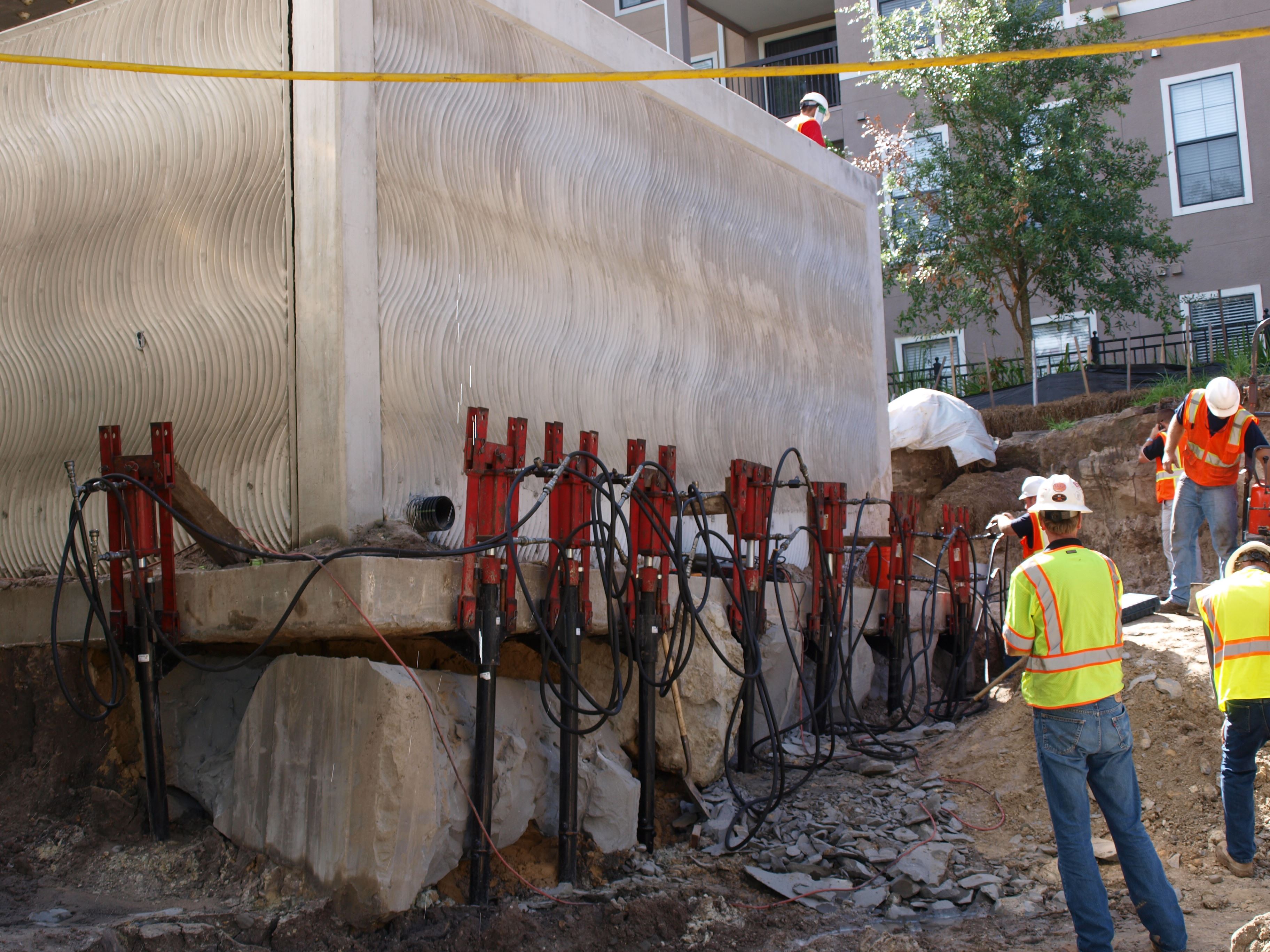 Conclusion: The piles were designed for a working load of 30 kips and spaced at approximately 40-inches on center around the settled portion on the structure. After all the piles were installed, a synchronized hydraulic lift system was used to raise the structure. During the lifting operation, the walls were realigned and closure of the stress cracks were gained. Ram Jack was able to accurately and safely restore the structure to its original position and support it to prevent its eminent collapse.