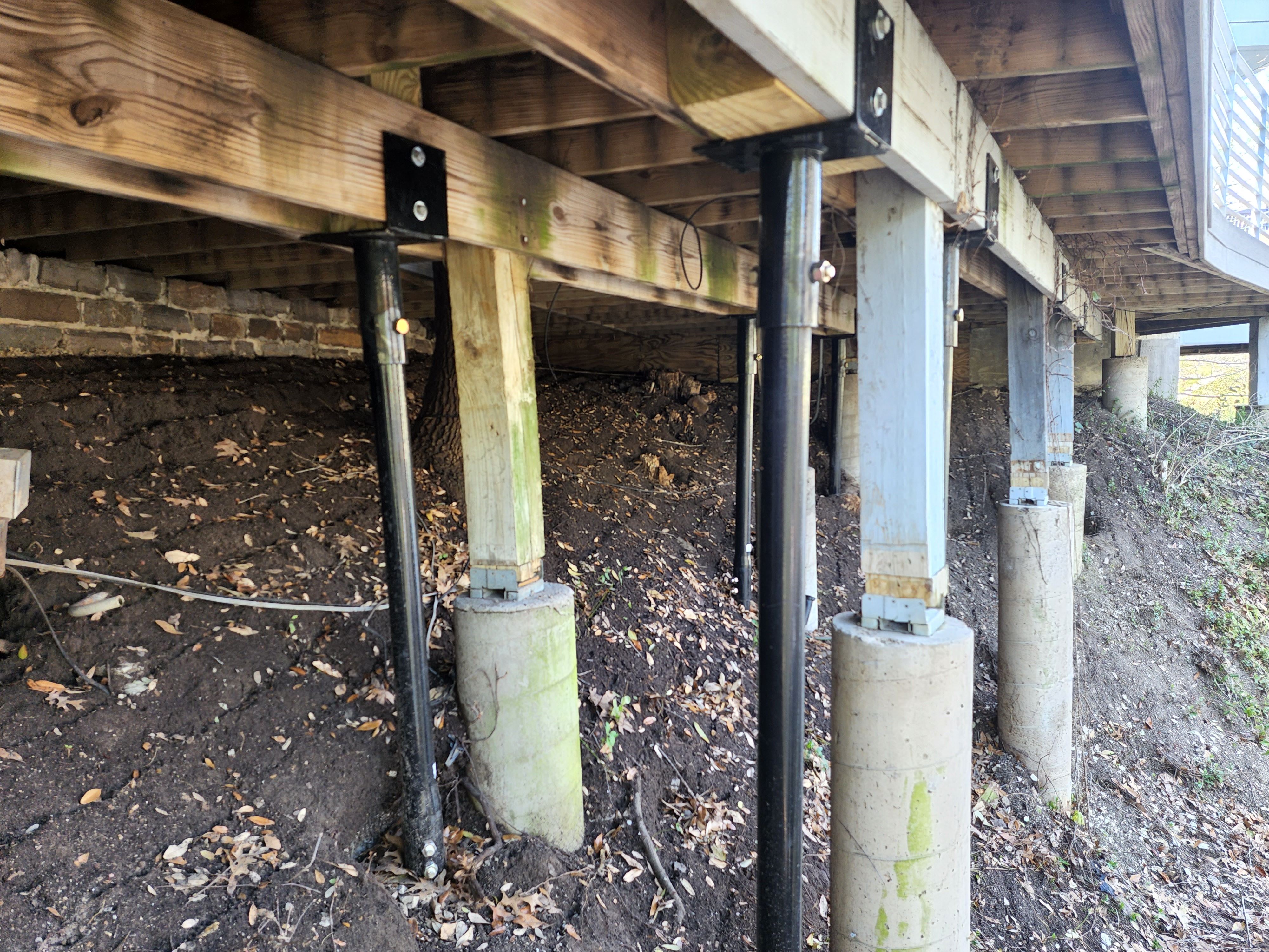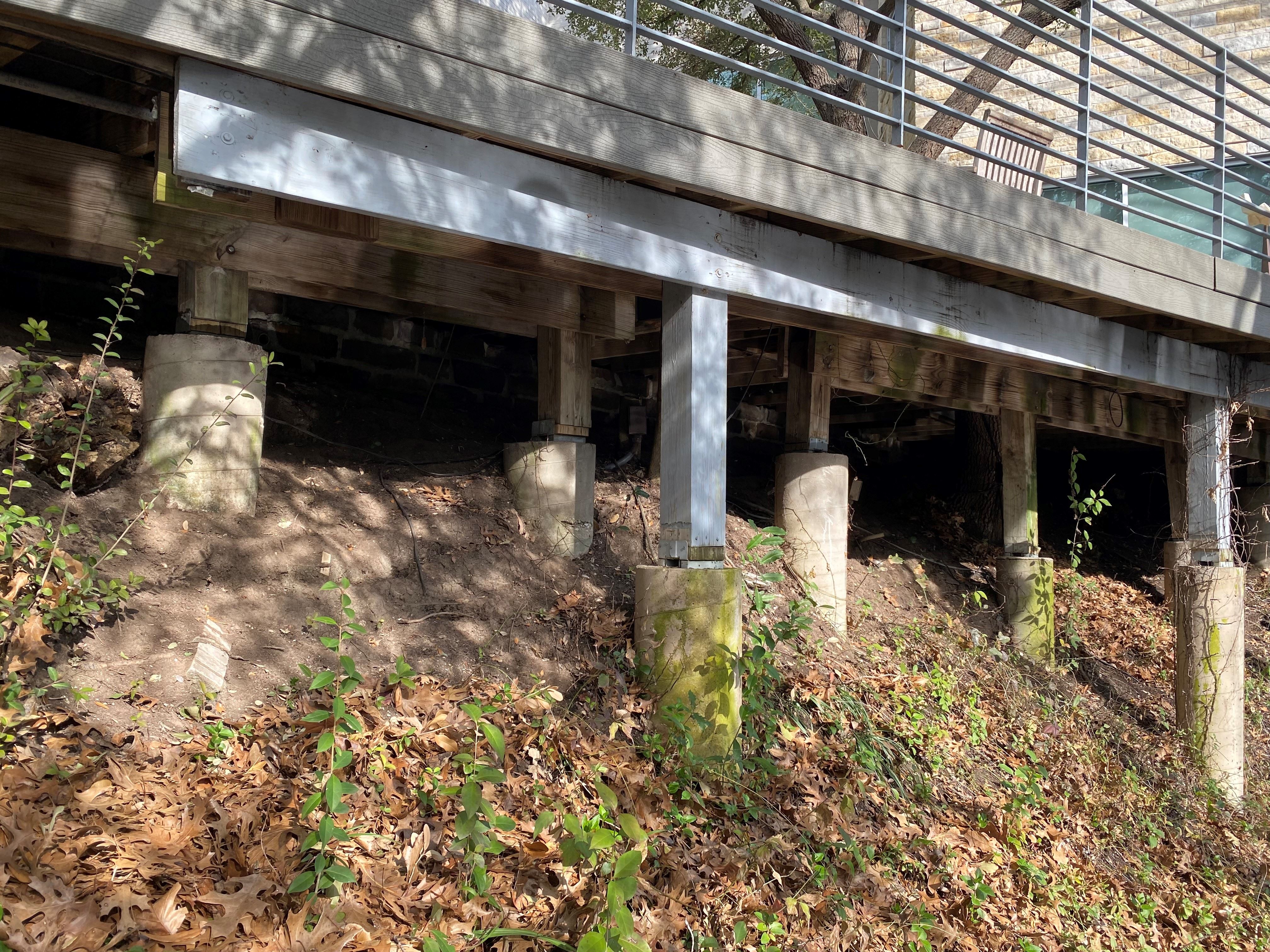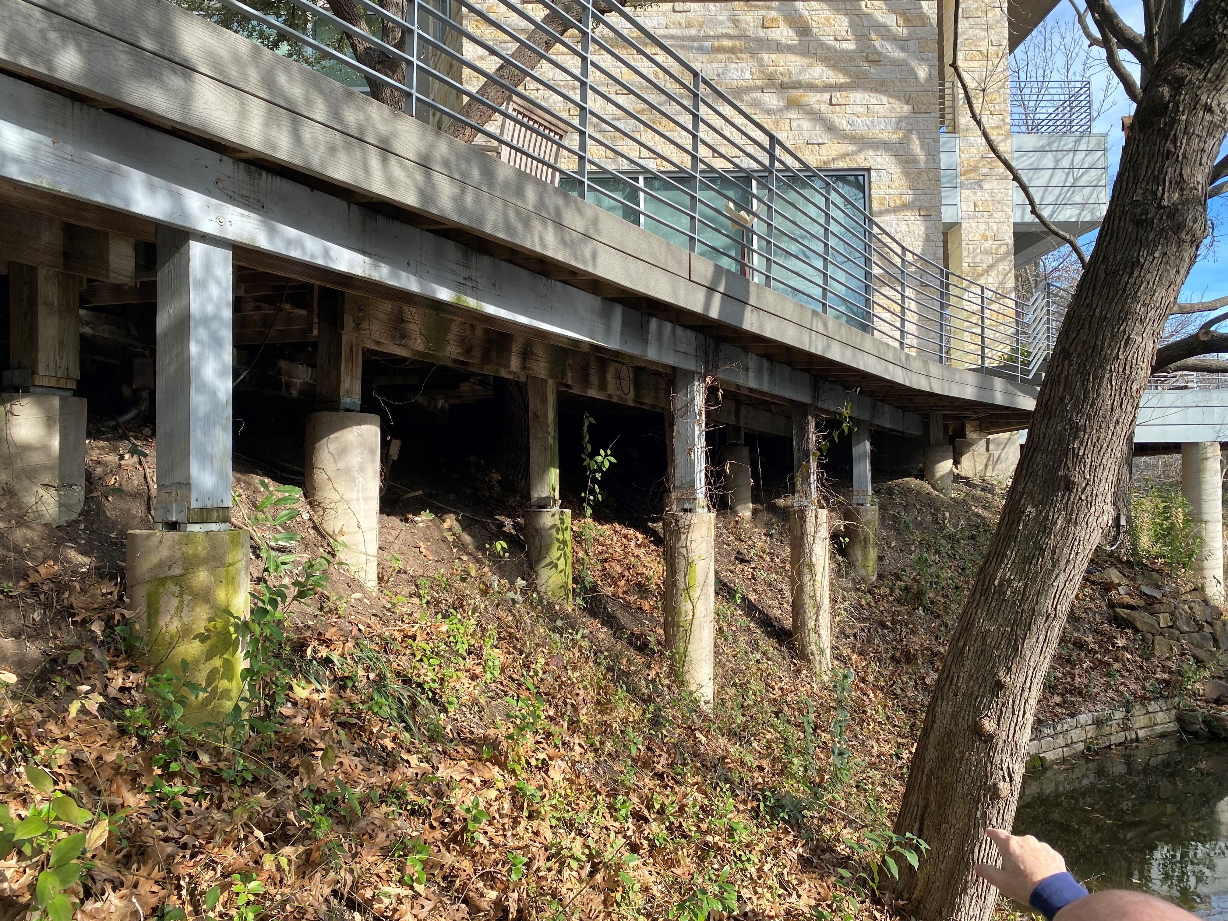 Mr. Barrick's large deck overlooks a beautiful pond in Dallas, TX. The deck was originally constructed to be supported by concrete piers. The concrete piers had previously settled and Mr. Barrick had to have the deck re-leveled and shimmed. Recently, the deck started having further settlement issues and instead of shimming for a second time, Mr. Barrick reached out to Ram Jack looking for a permanent solution. He is a retired architect and wanted an engineered solution to the problem. Ram Jack worked with Fortified Engineering to design a custom solution to repair and support Mr. Barrick’s deck.