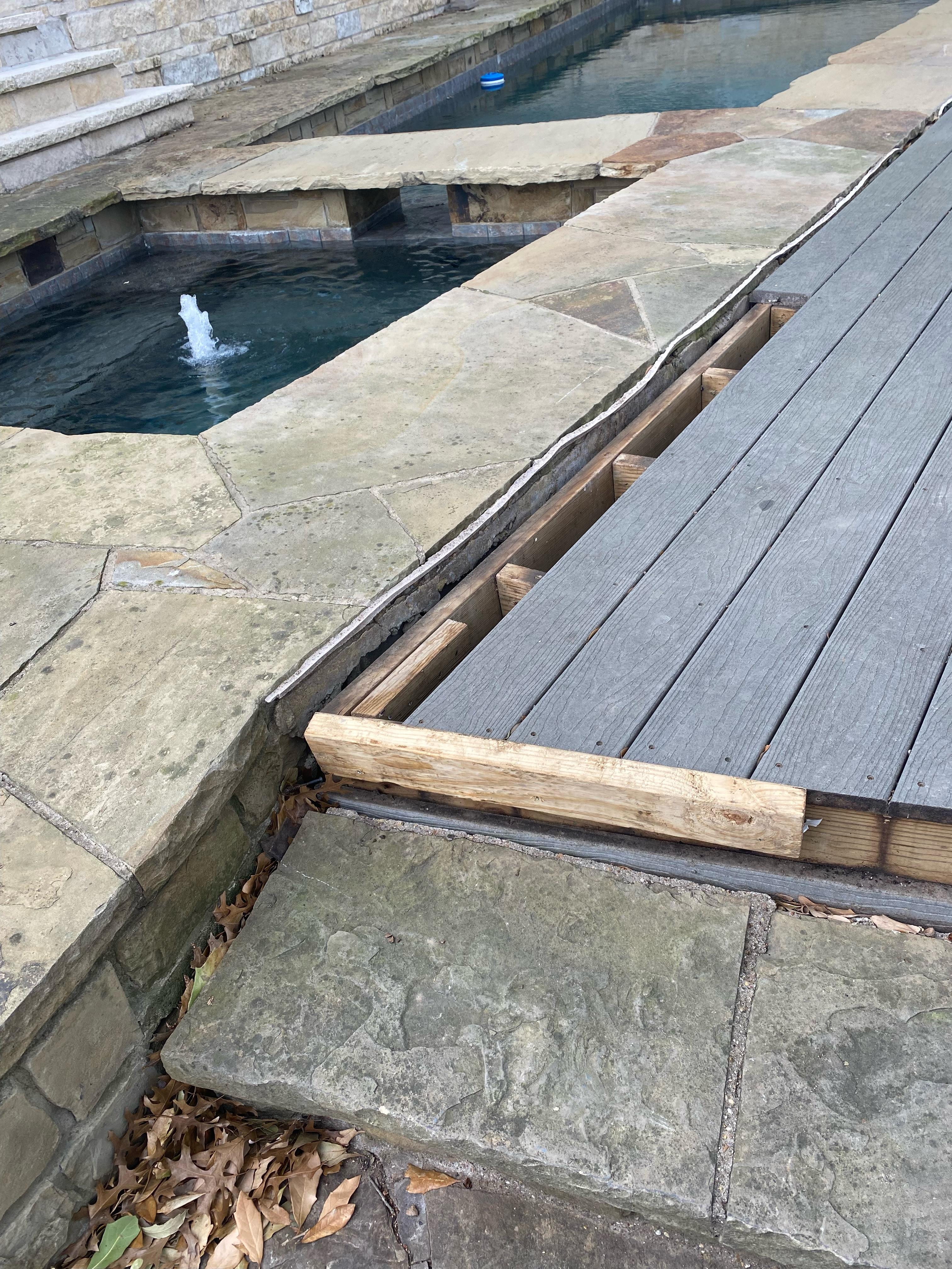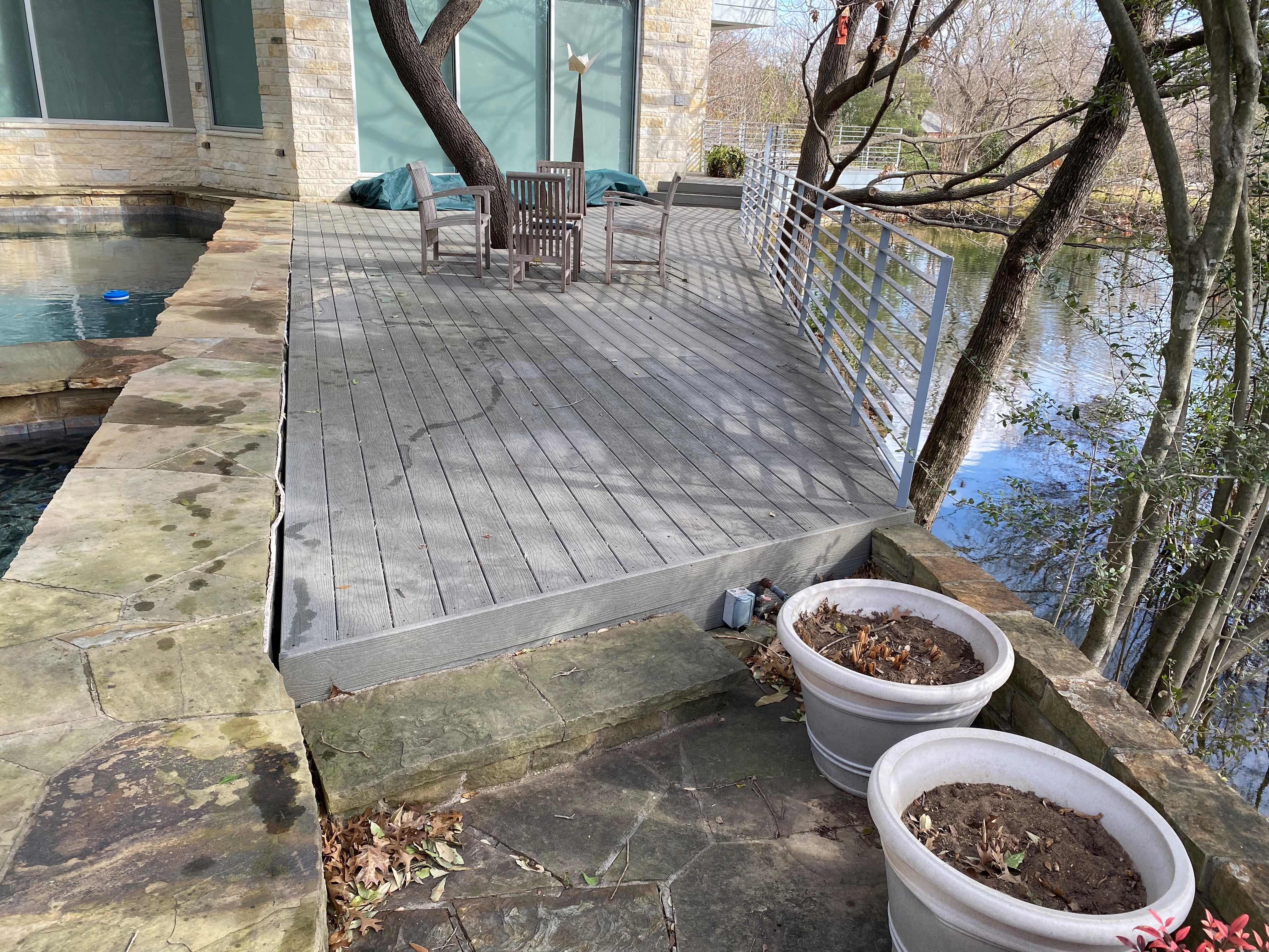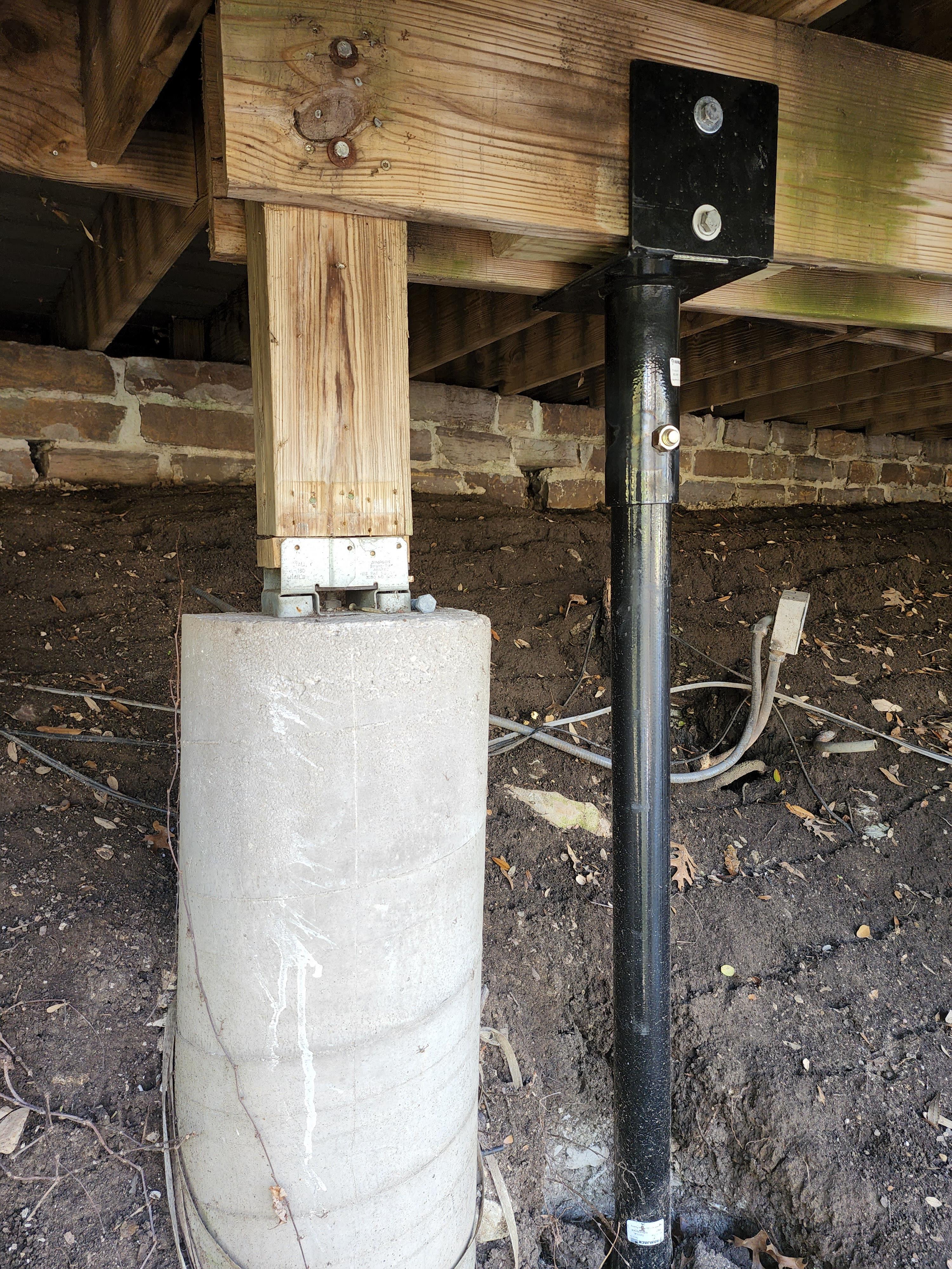 Mr. Barrick's large deck overlooks a beautiful pond in Dallas, TX. The deck was originally constructed to be supported by concrete piers. The concrete piers had previously settled and Mr. Barrick had to have the deck re-leveled and shimmed. Recently, the deck started having further settlement issues and instead of shimming for a second time, Mr. Barrick reached out to Ram Jack looking for a permanent solution. He is a retired architect and wanted an engineered solution to the problem. Ram Jack worked with Fortified Engineering to design a custom solution to repair and support Mr. Barrick’s deck.