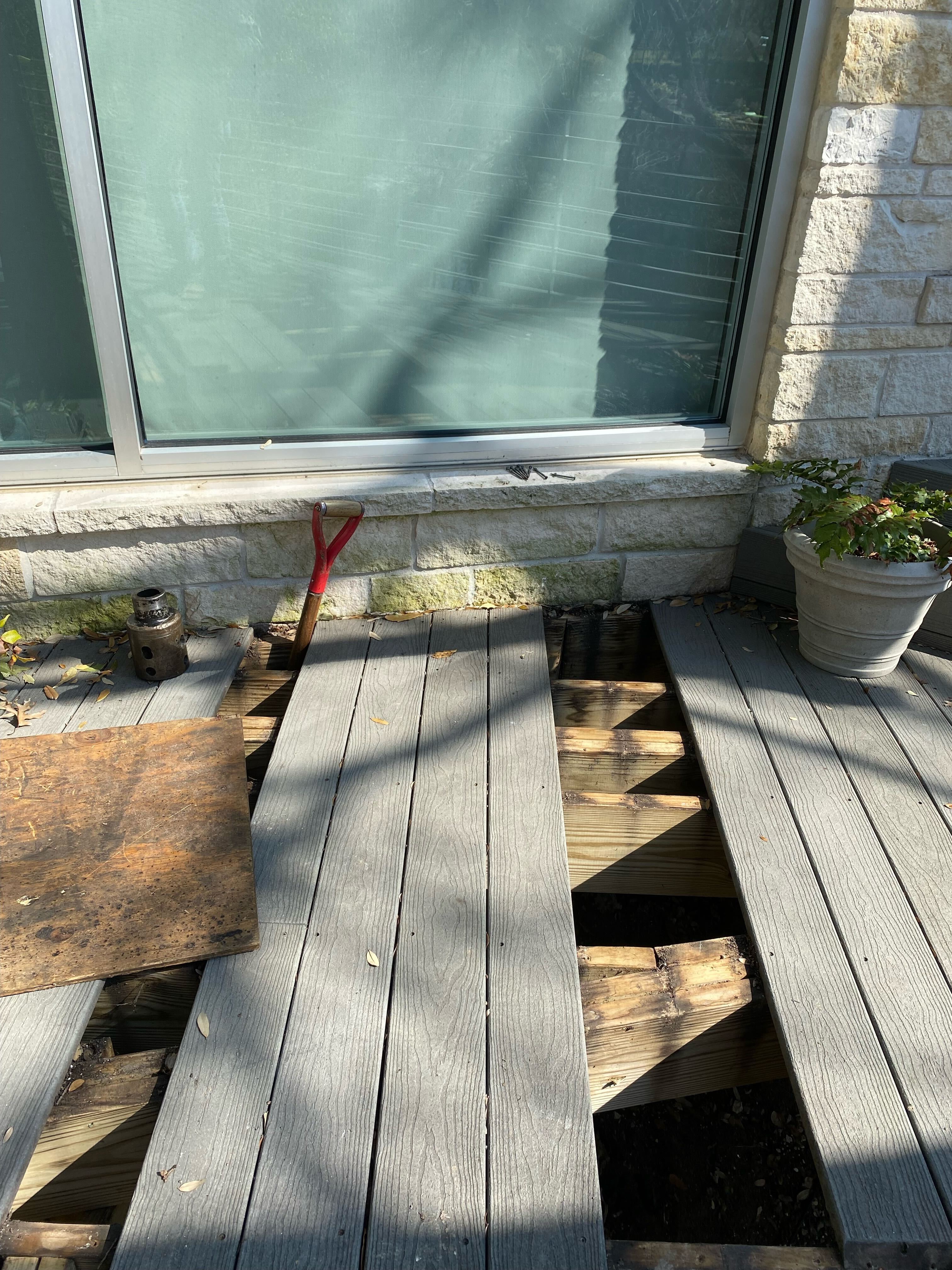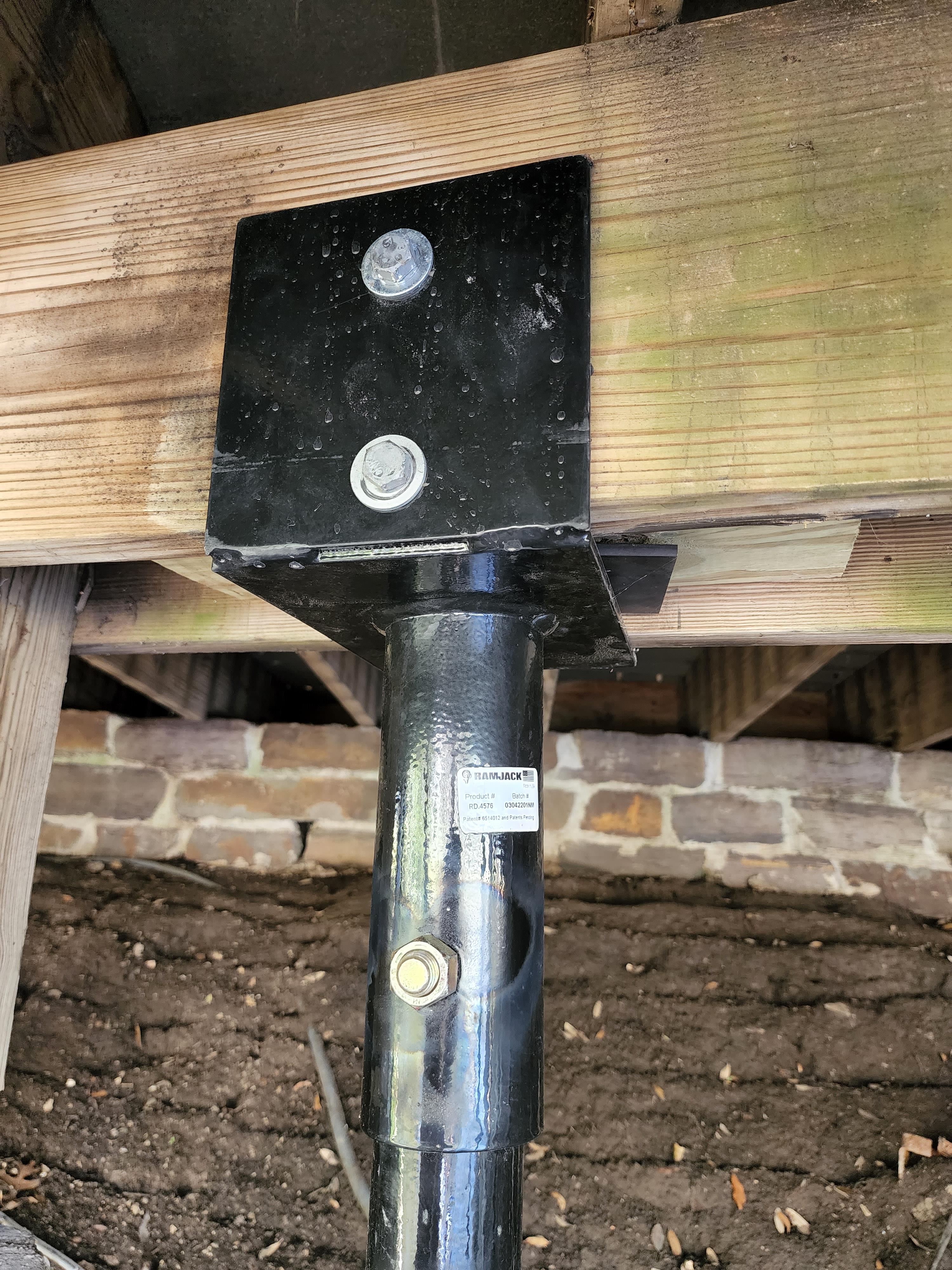 Ram Jack removed portions of decking to install helical piles from the top of the deck. The deck is now supported by a permanent foundation solution and guaranteed against further settlement. Mr. Barrick chose to put nothing down and finance one year same as cash through Greensky. Overall, this project was a success and the homeowner can now enjoy the view from his deck without worrying about having settlement issues in the future.