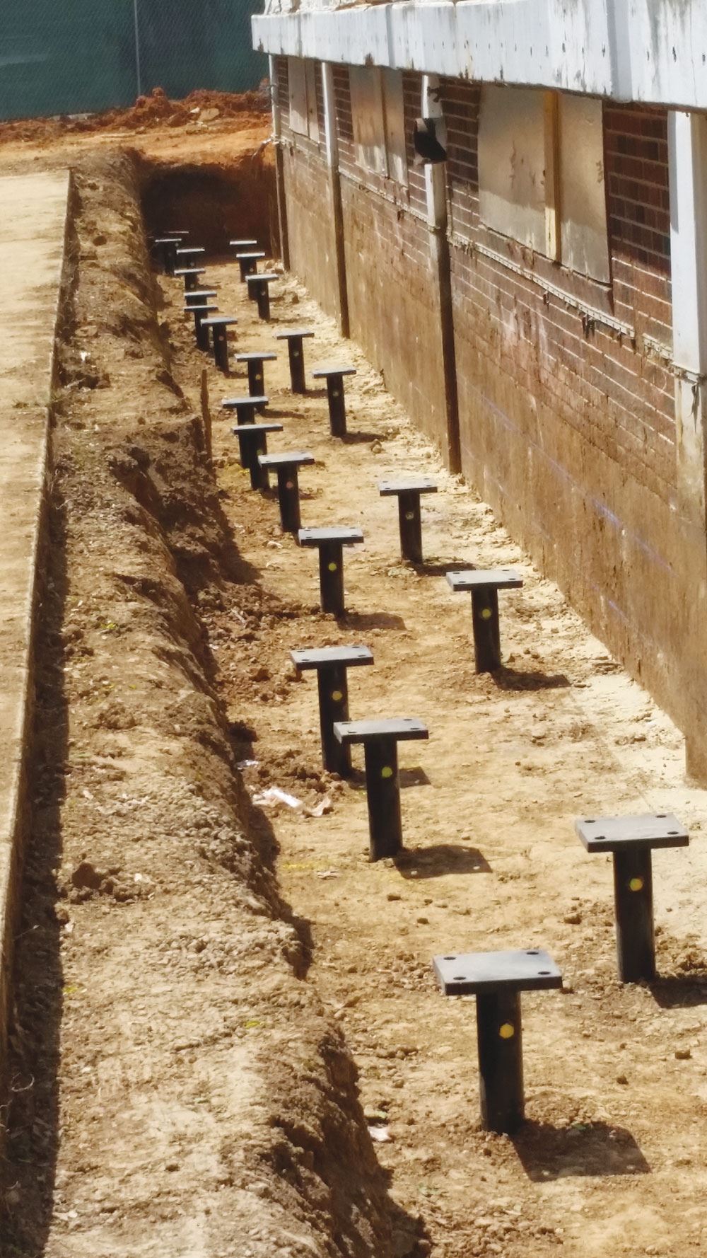 Outcome: Over the course of four days, Ram Jack installed 133 helical piles, with pre-construction brackets, to an average depth of 25 ft. Twelve extra piles were added to maximize support and keep the spacing of piles even. Henson Construction supervisors were astonished at the speed and quality of the work, as other contractors proposed that the job would take 12-15 days to complete.