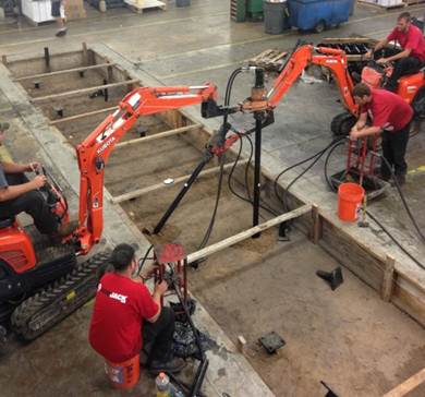 Conclusion: The new foundation was to be 40’-0 long, 7’-6” wide and 18” thick. A total of (24) 2 7/8” diameter Ram Jack helical piles were required. Fourteen of the piles were placed vertically and the remaining ten piles were placed at a batter to resist the dynamic lateral loads generated by the machine.
