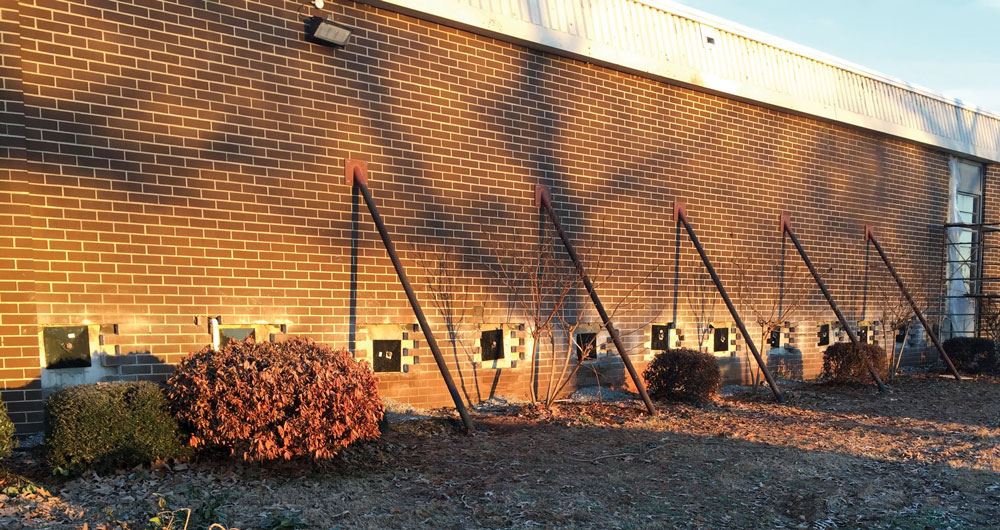 Outcome: Alabama Ram Rack installed tie-back anchors in only two days using small, portable equipment. The anchors were grouted and allowed to cure for one week before Ram Jack tie-back plates were applied. New bricks were installed over the low-profile, tie-back brackets to conceal the structural repair. In the end, thirteen (13) 2 3/8in. helical piles with threaded connections were installed to an average depth of 12 ft., providing the support the structure needed to continue its education of bright young minds without having to worry about the integrity of the structure and the safety of the students.