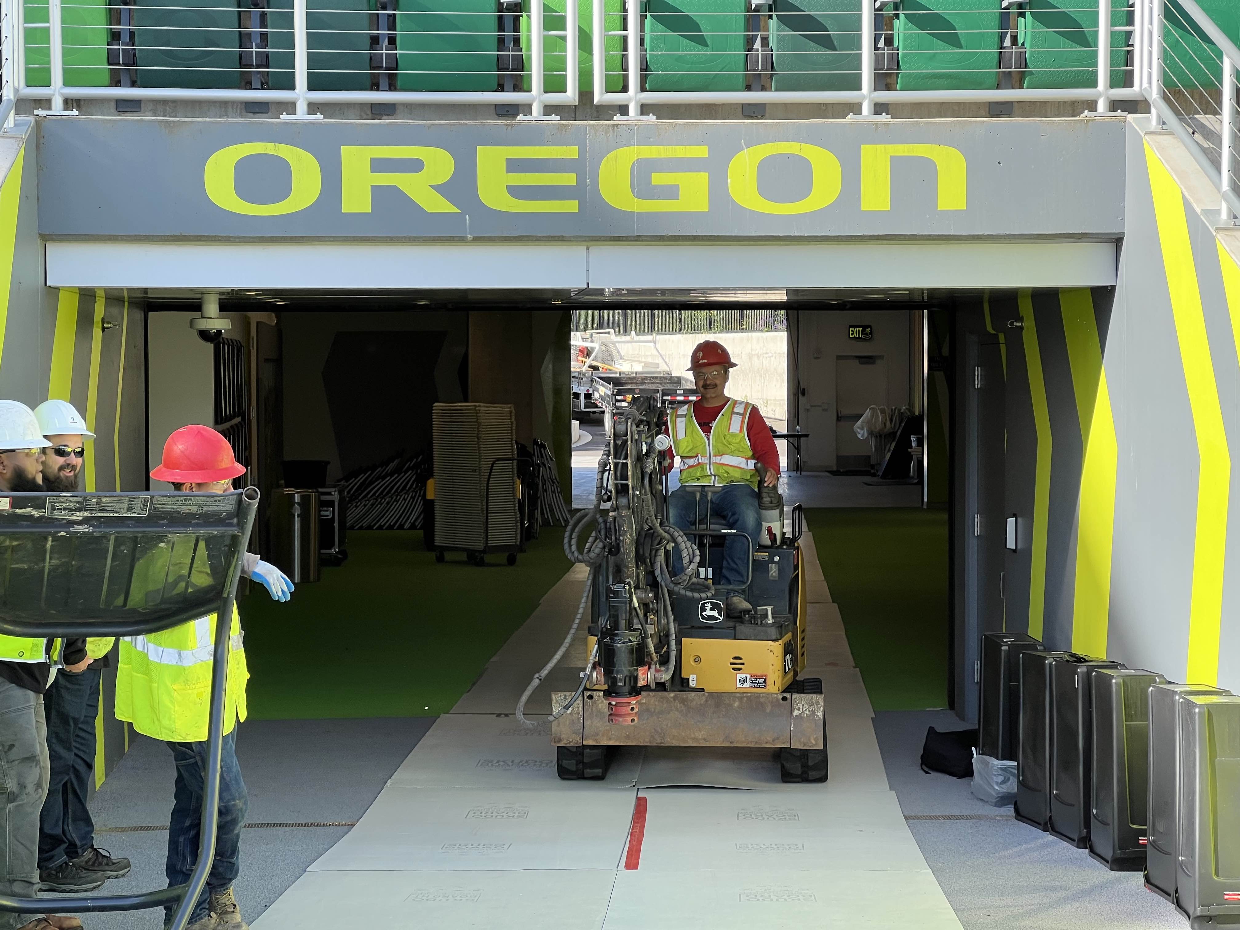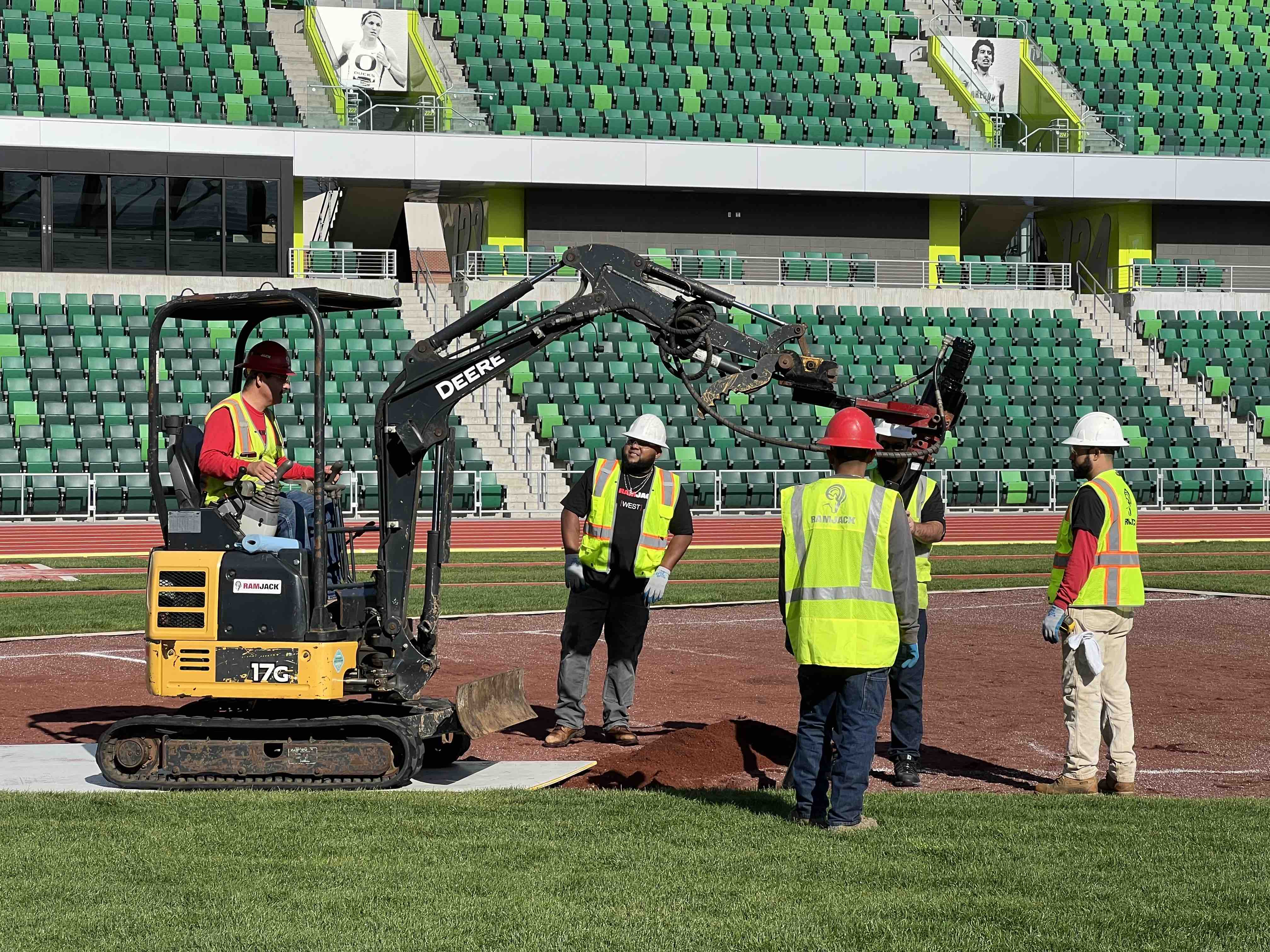 When they built the track, they excavated the infield, placed 3 ft of compacted rock, then fabric, then sand, then the turf. The contractor first tried to screw in small anchors by hand, but he was unsuccessful because he couldn’t get through the rock.