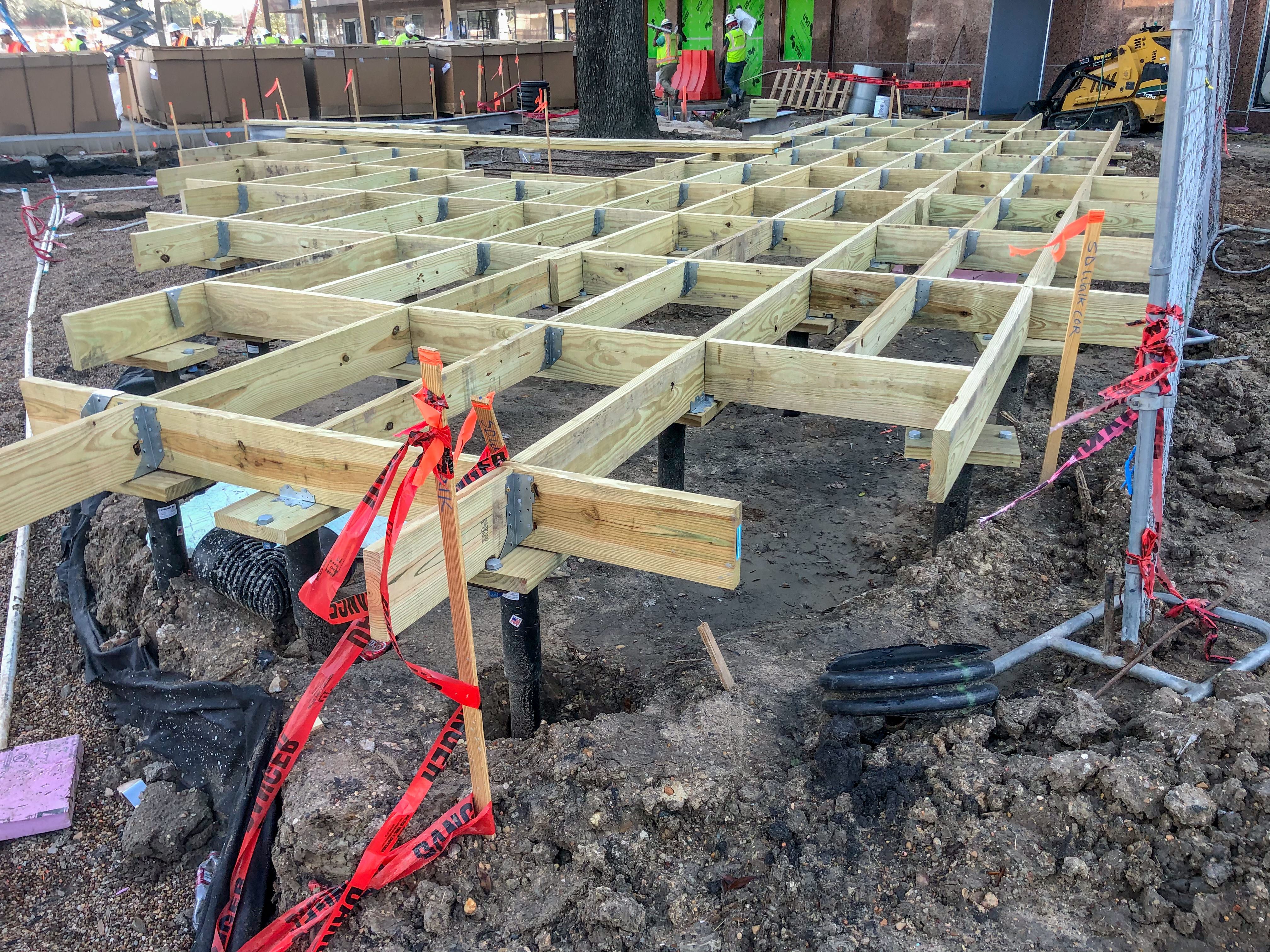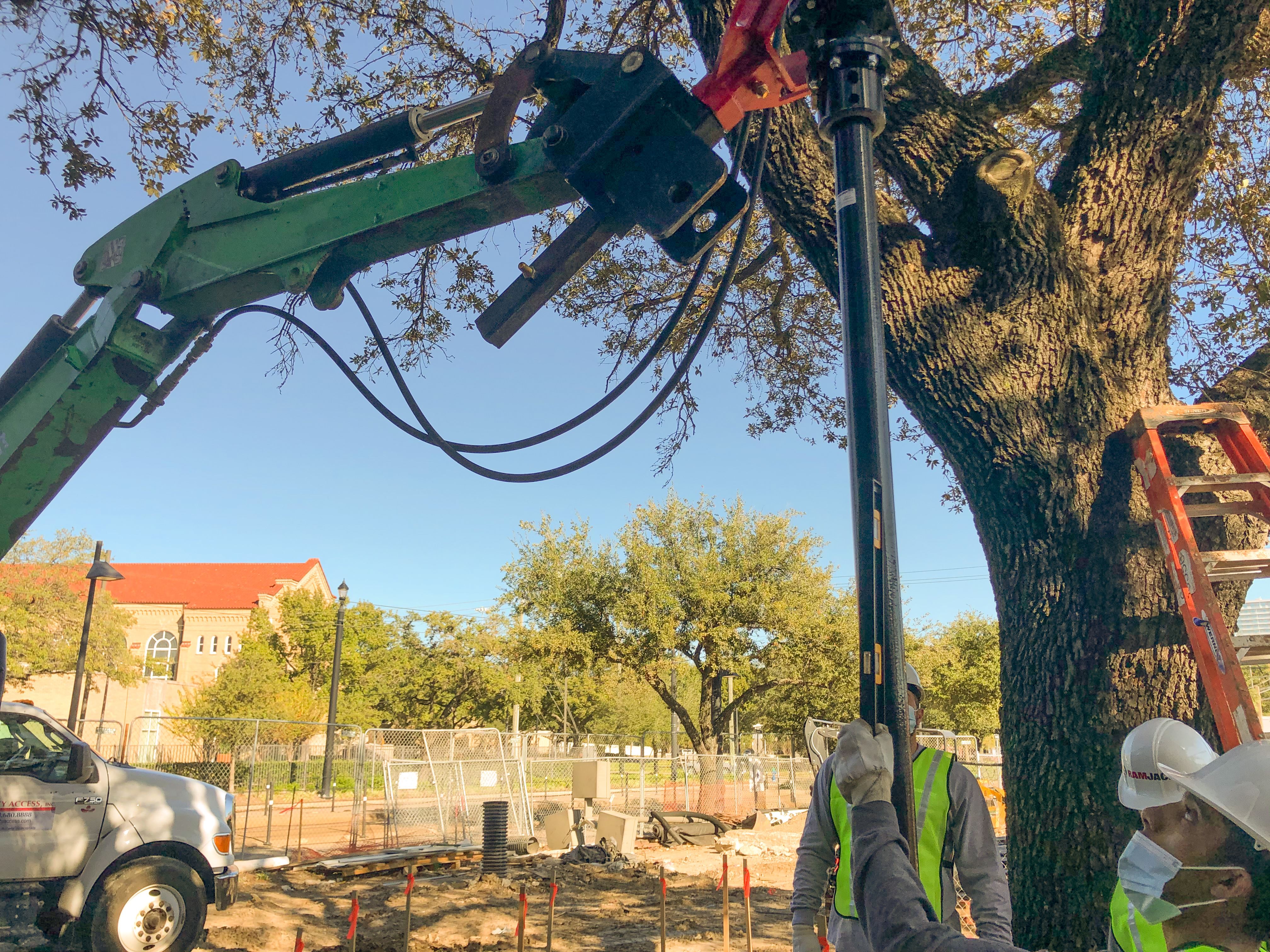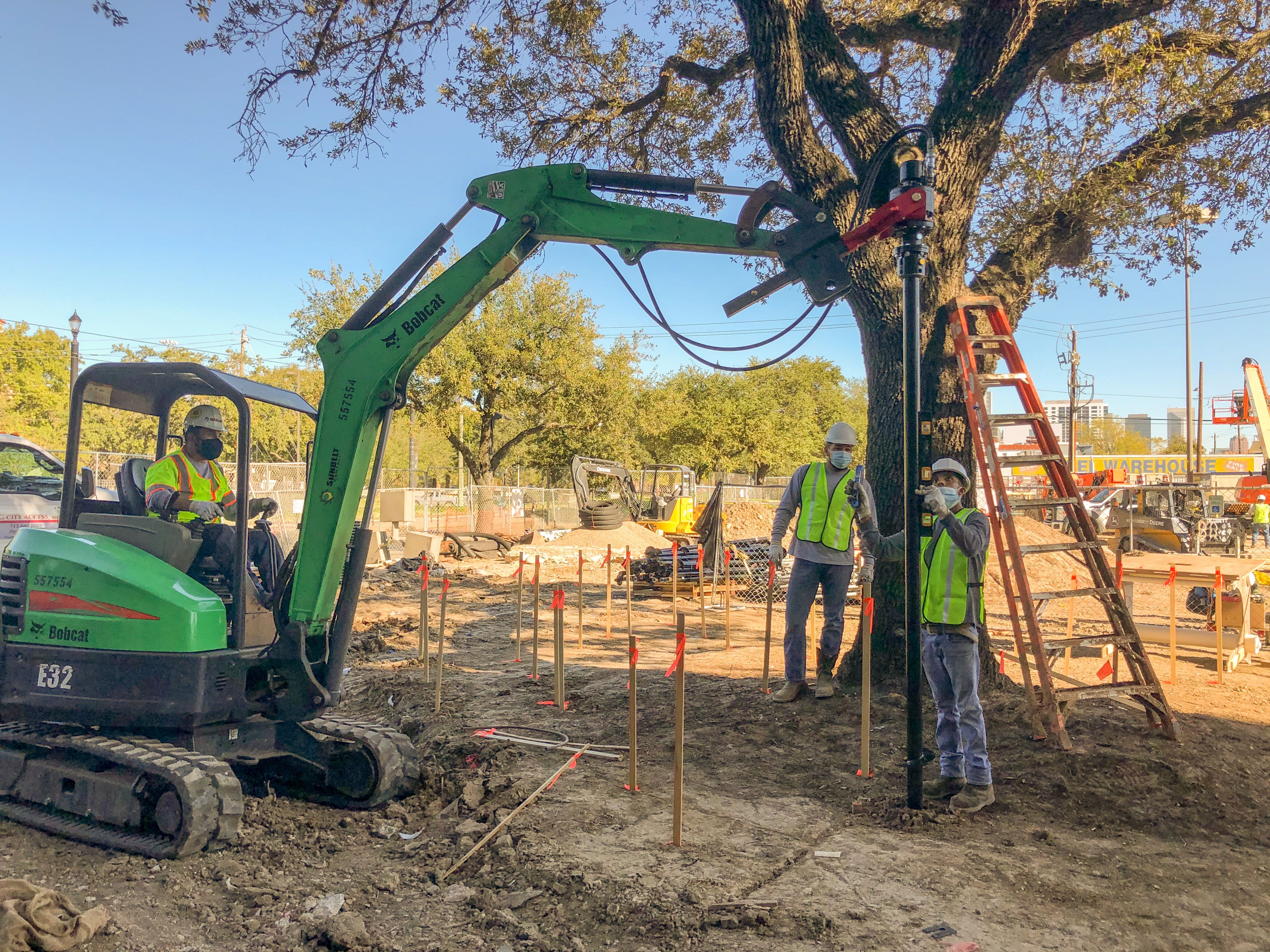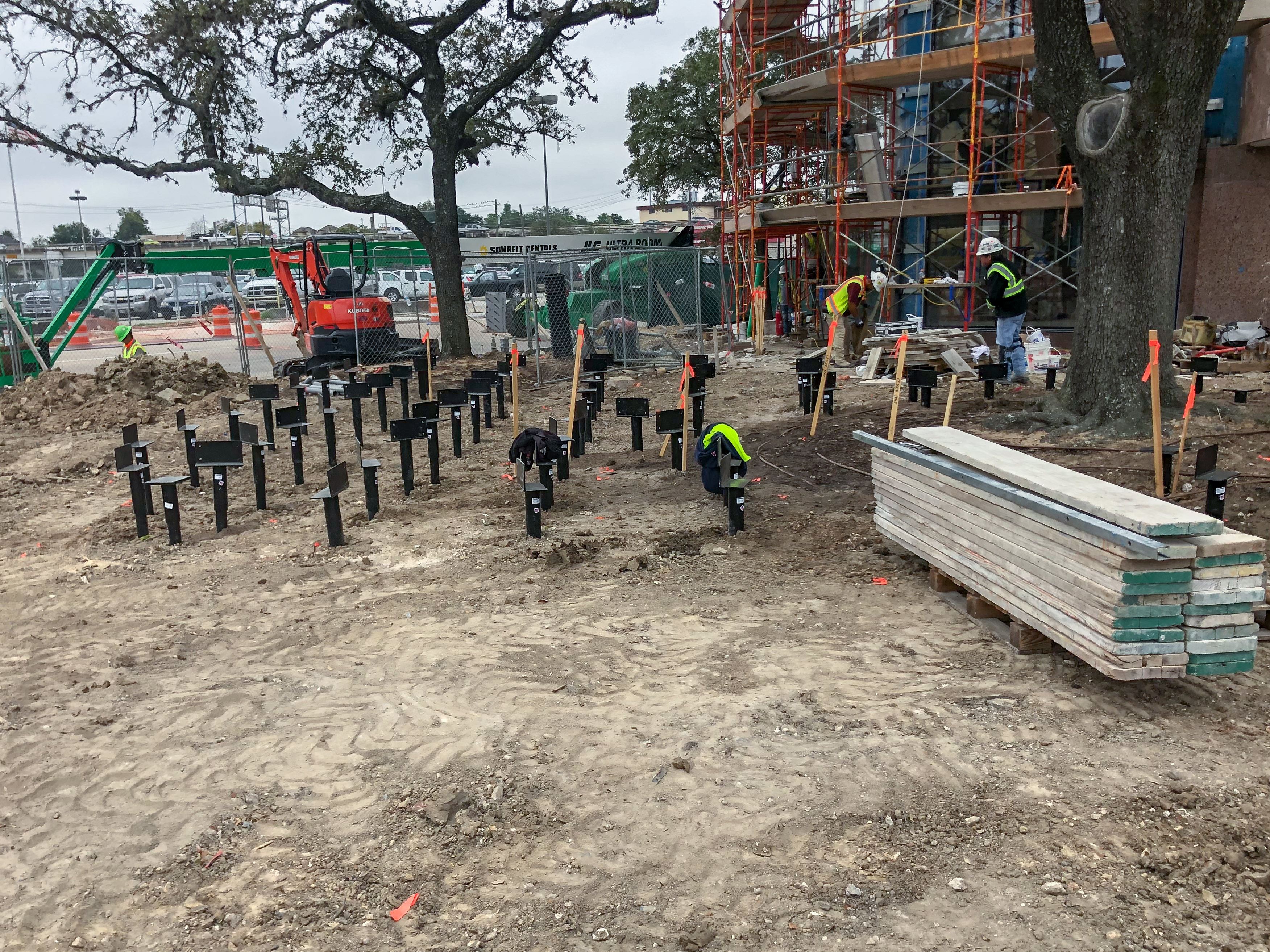 This is a large wooden deck foundation project for Rice University near downtown Houston, Texas. Walter P. Moore and Associates designed helical supports for two separate 2’x 8’ wooden decks that surrounded two large oak trees. Because of the small working space and the trees root system, the Ram Jack helical pile was a great solution. An arbor was called in to locate the root systems of the trees. This was a challenge for the lay-out of the helical piles. During the project we installed (160) 2 7/8” TC piles with a 7k driver and a minimum installation torque of 1,600 ft-lbs. The piles had an average depth of 21’. The bracket was a 4079 New Construction bracket and the contractor welded a Simpson Bracket to attach the 2”x 8” supports. Ram Jack scheduled (8) days to complete the project and the crew completed the project in (4) 11hr days. Ram Jack only had to move one pile a couple of inches to avoid the root system of one of the trees. The Contractor was grateful that Ram Jack was able to finish the project early.