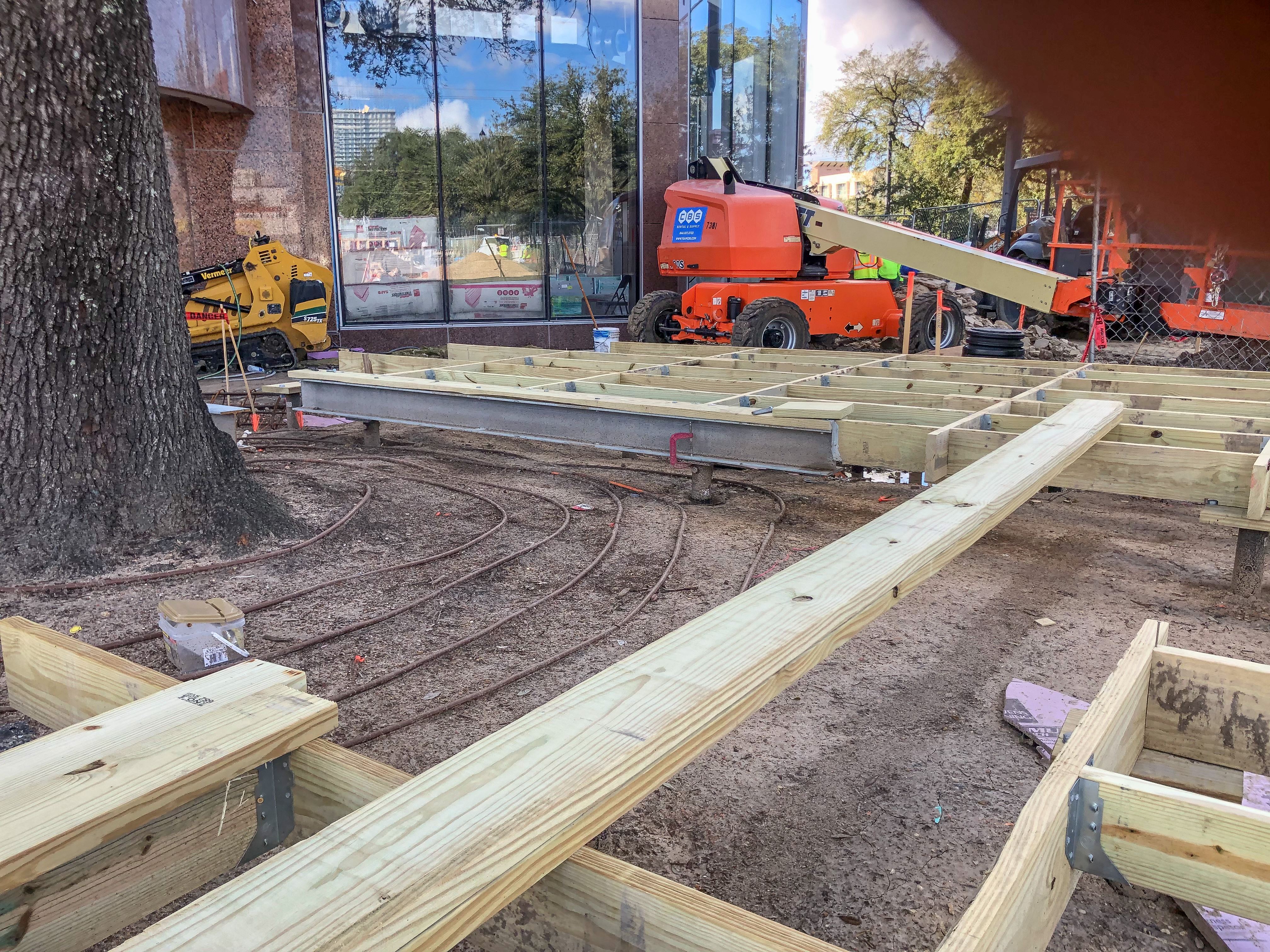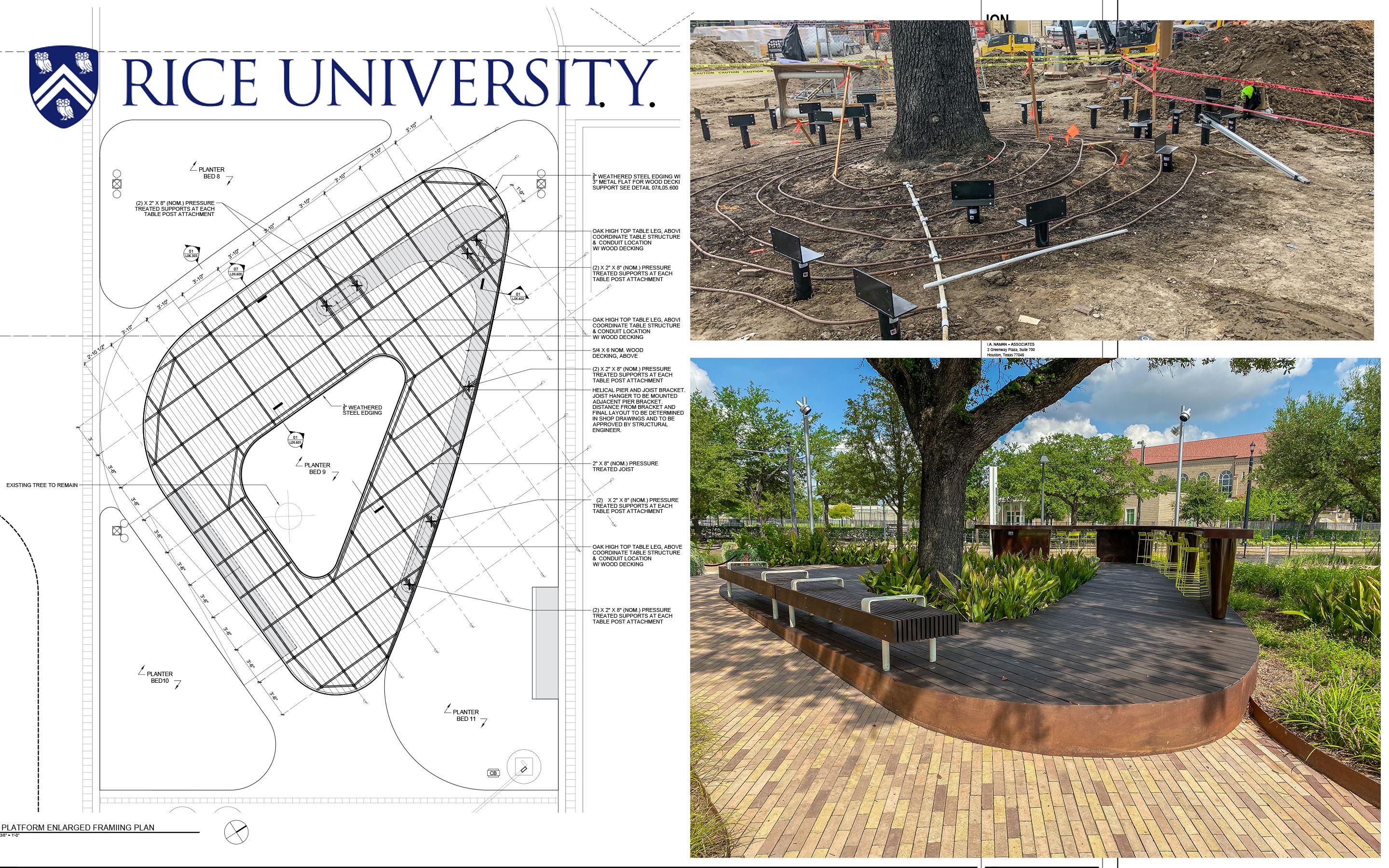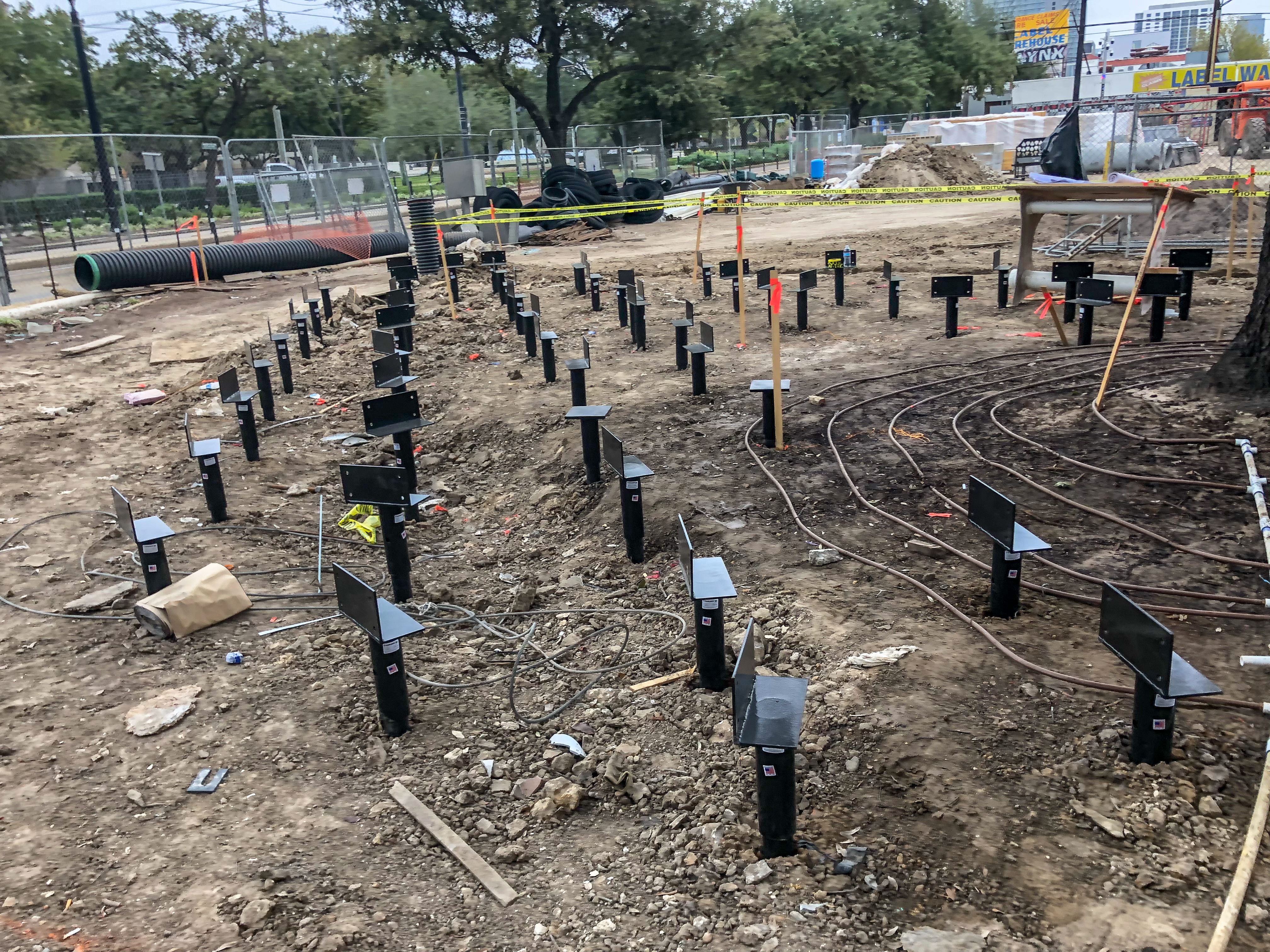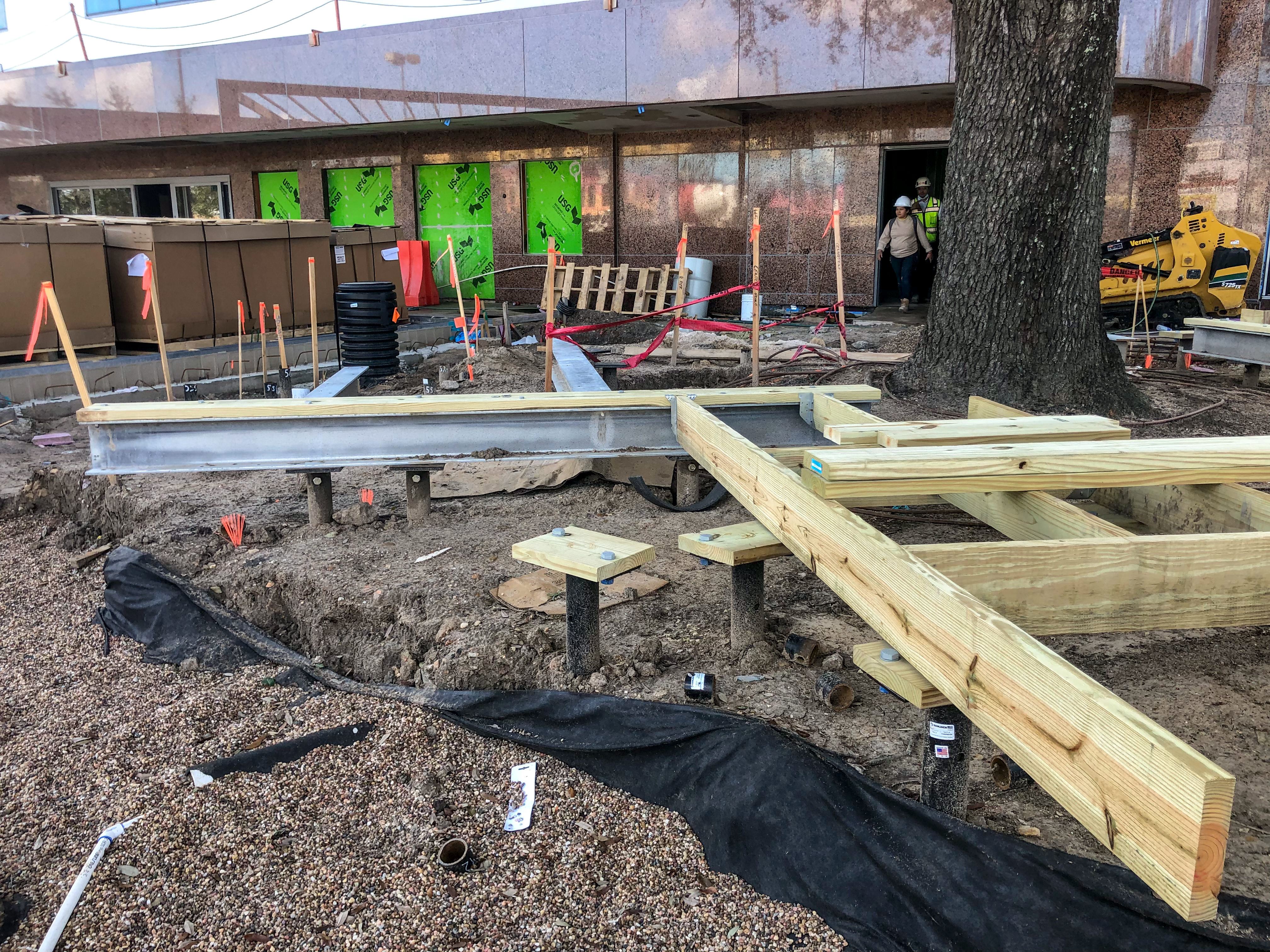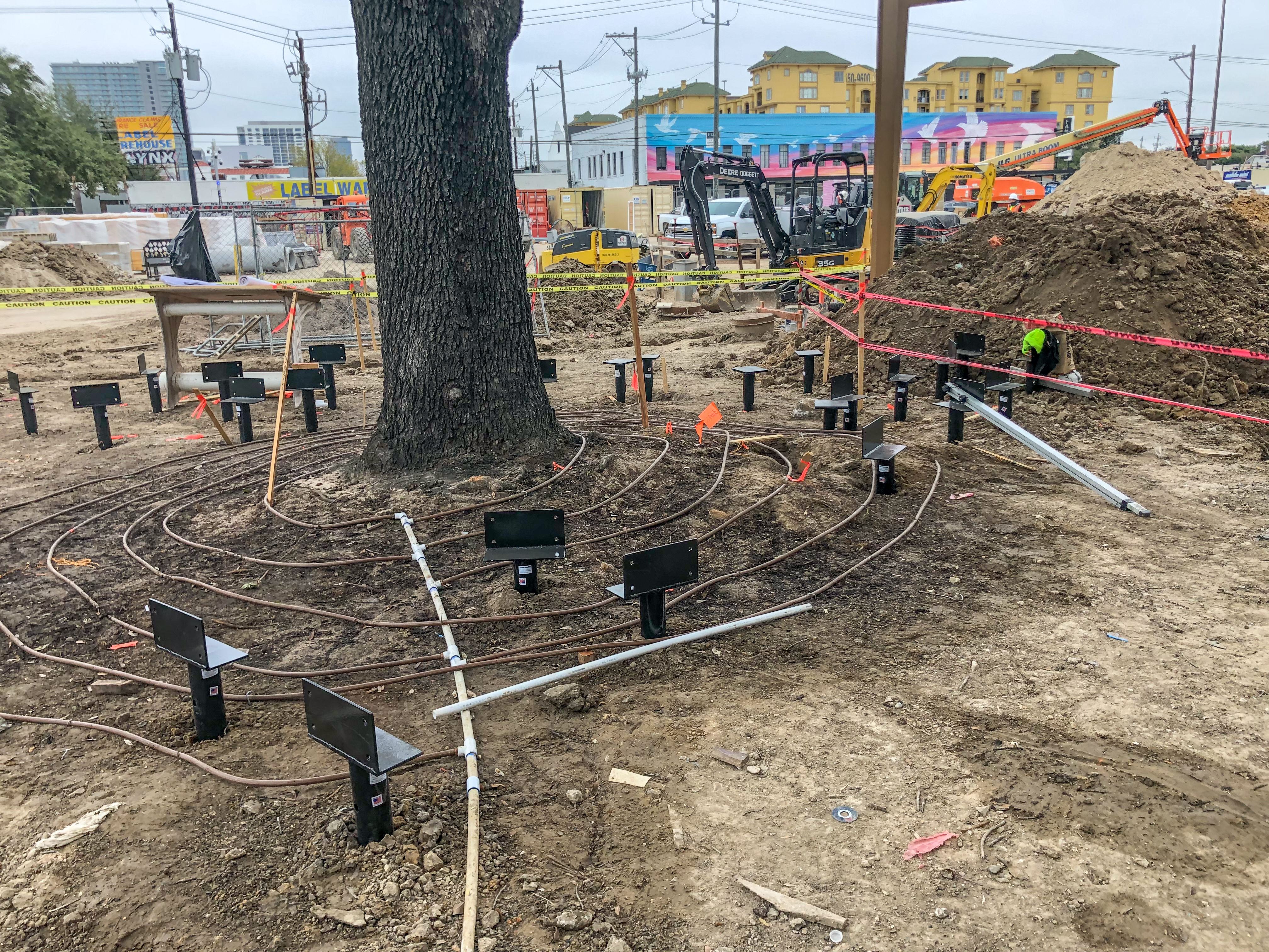 This is a large wooden deck foundation project for Rice University near downtown Houston, Texas. Walter P. Moore and Associates designed helical supports for two separate 2’x 8’ wooden decks that surrounded two large oak trees. Because of the small working space and the trees root system, the Ram Jack helical pile was a great solution. An arbor was called in to locate the root systems of the trees. This was a challenge for the lay-out of the helical piles. During the project we installed (160) 2 7/8” TC piles with a 7k driver and a minimum installation torque of 1,600 ft-lbs. The piles had an average depth of 21’. The bracket was a 4079 New Construction bracket and the contractor welded a Simpson Bracket to attach the 2”x 8” supports. Ram Jack scheduled (8) days to complete the project and the crew completed the project in (4) 11hr days. Ram Jack only had to move one pile a couple of inches to avoid the root system of one of the trees. The Contractor was grateful that Ram Jack was able to finish the project early.
