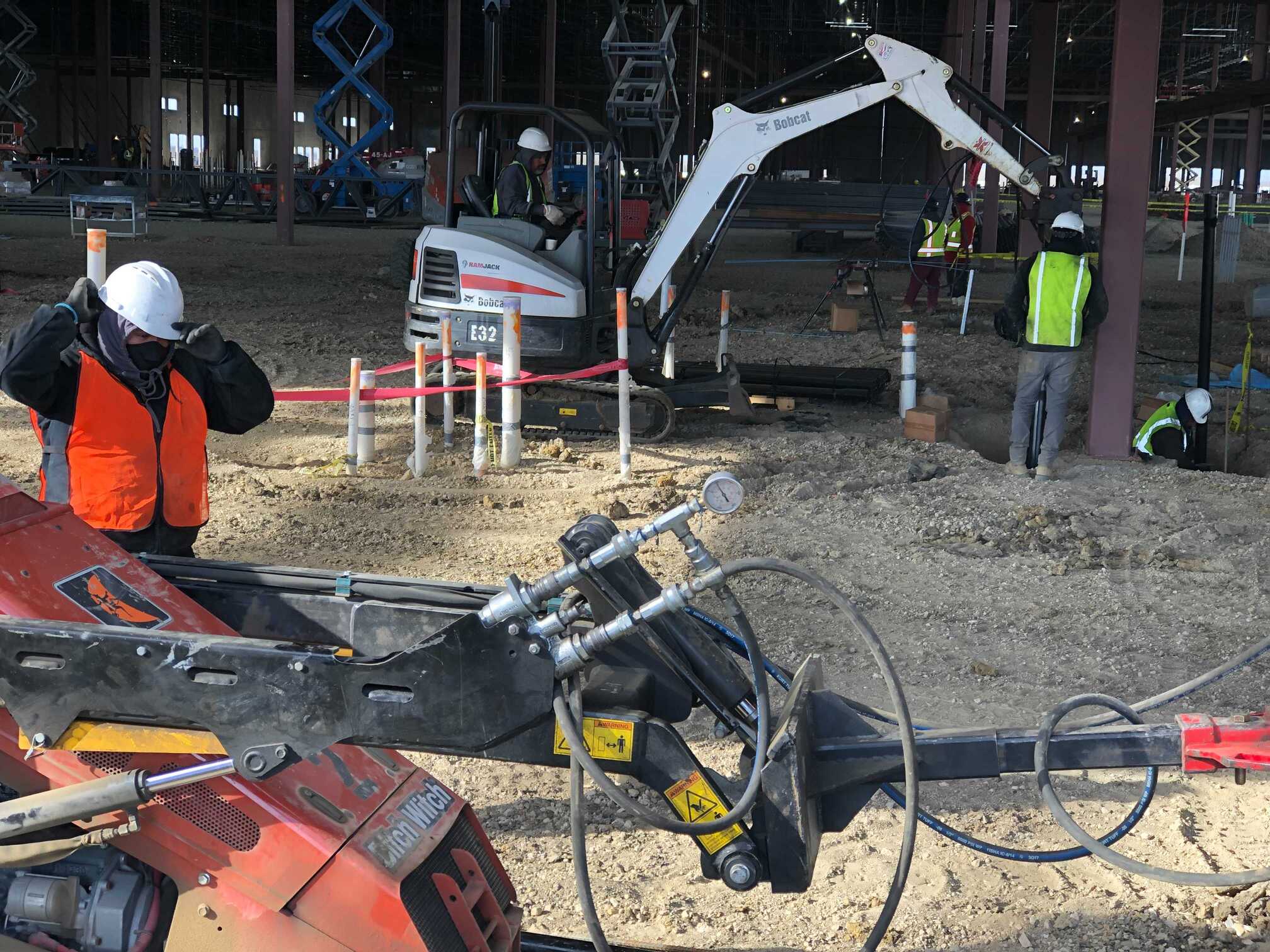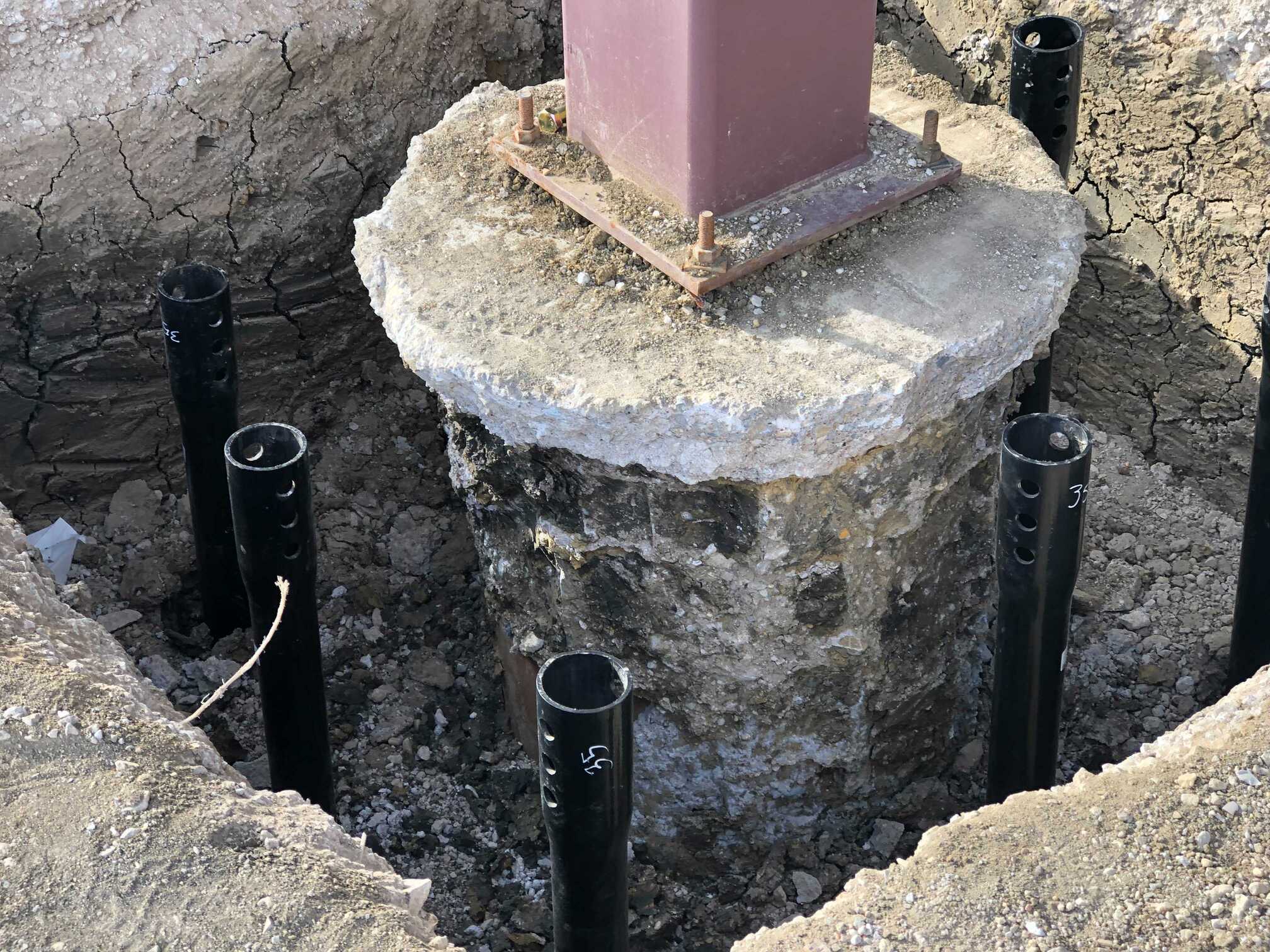 A 686,000 ft2 office/warehouse was under construction for Sunrider International in Midlothian, TX. The building consisted of 9 ¼” thick tilt wall panels and steel columns supported on 24” diameter under reamed concrete piers. Soon after the panels were set into place, the panels began to settle. Some of the panels settled as much as 5-inches before the roof had even been installed. Sunrider hired a new construction team to determine the cause of the settlement and to provide the most cost-effective solution. James F. Turner Engineers and Alpha Testing became the new Structural and Geotechnical EOR’s for the project. It was quickly determined that some of the existing concrete piers were under designed to support the structural loads of most of the tilt wall panels and the mezzanine. Alpha Testing had worked with Ram Jack and Fortified Engineering Solutions on a similar project so recommended them on this one.