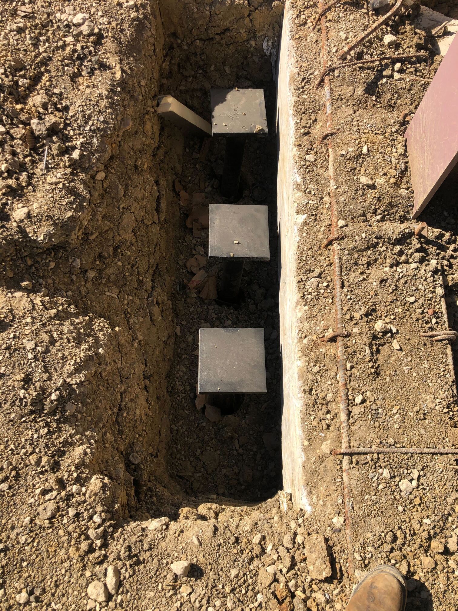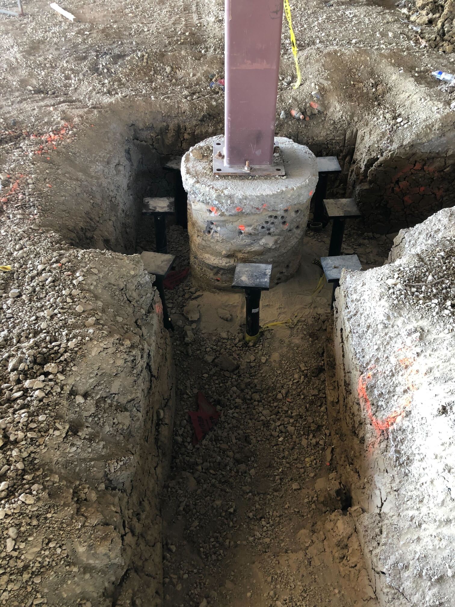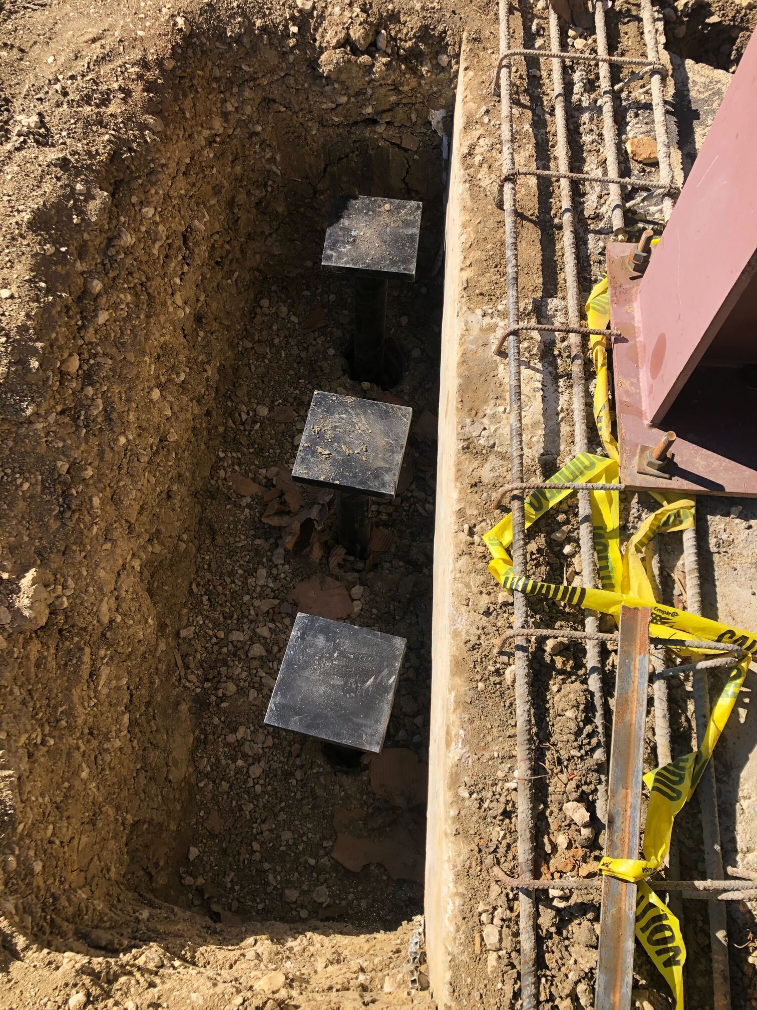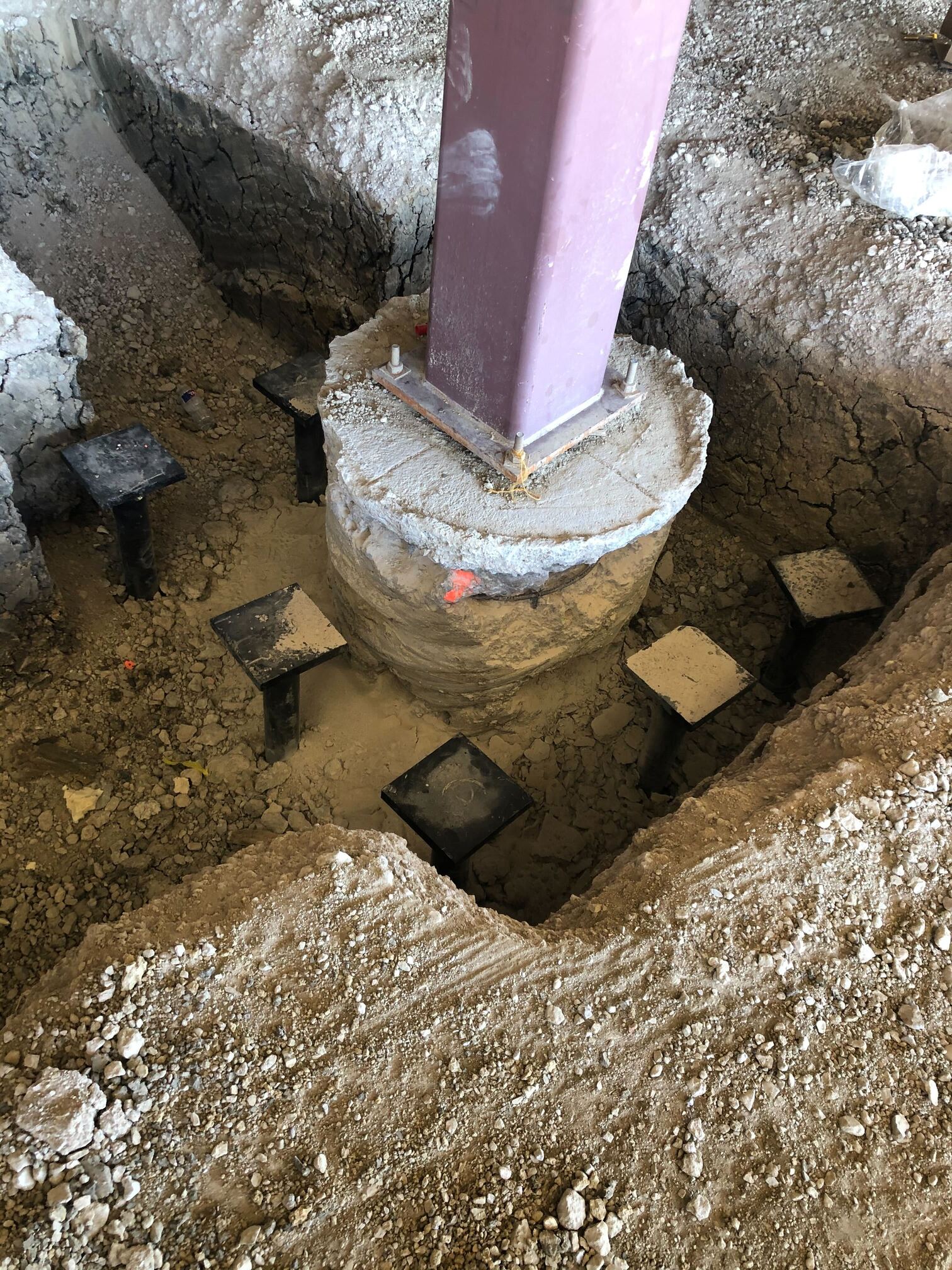 With the structural loads and soil borings being provided by the EOR’s, Fortified Engineering Solutions designed 3 ½” diameter driven piles to raise the tilt wall panels to their proper elevation and prevent any future settlement. James F. Turner Engineers and Alpha Testing also preformed an analysis on the concrete piers supporting the mezzanine columns and found them to be under designed as well. Fortified Engineering Solutions designed 3 ½” diameter new construction helical piles to support the excess mezzanine load that exceeded the capacity of the existing concrete piers.