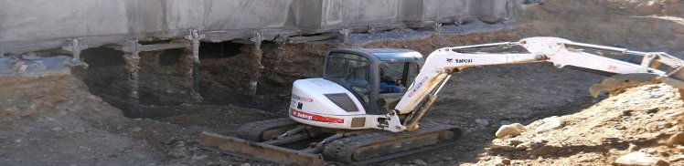 The hollow bar and continuous grouting method was chosen to help keep the piles as close to the face of the wall as possible, again to reduce eccentric loads. Pilasters were supported by groups of micropiles with underpinning brackets. After the micropiles were installed, the general contractor excavated under the existing foundation in approximately 6-feet long sections and installed new footings and Basement foundation walls.