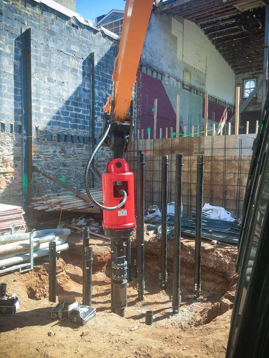 Over the course of four months, during seven mobilizations, Ram Jack worked with other site contractors to install pile caps and grade beams to the all-concrete structure. After site contractors removed the rear wall of the existing structure and underpinned the existing stone walls, Ram Jack was able to drive helical piles beneath the existing building. Engineers relied on Ram Jack’s ability to custom-design installation plans as well as custom-manufacture steel piles.