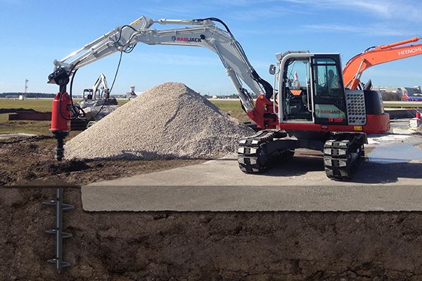 Proposed Solution: The engineers ultimately agreed upon a deep foundation solution consisting of 44 Ram Jack helical piles, each configured in a 10”/12”/14” helix arrangement on a 3.5 in. diameter pile shaft. These piles were to be installed at a depth and torque appropriate for an ultimate capacity of 84.4 kips in axial compression. Ram Jack arrived on-site February 5, 2015 to begin installation of a load verification test pile in the area of anticipated work. The test pile was of the same 10”/12”/14” configuration on a 3.5 in. pile shaft. The test pile achieved target installation torque at an embedment depth of approximately 94 ft. Four reaction piles were also installed to facilitate a live load test of the pile. The following morning, successful tension and compression load tests were performed in the presence of the Parsons Brinkerhoff engineers and relevant airport personnel. Work commenced February 7 and progressed at the rate of approximately five completed pile installations per day. The powered equipment required for this installation consisted of one Takeuchi TB1140 excavator equipped with a Pro-Dig V55K drive head and Pro-Dig Intelli-Tork wireless monitoring system. Additional equipment included two Bobcat mini-excavators, used to facilitate preparatory soil work.