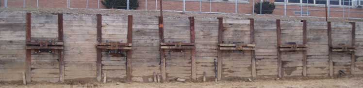 Solution: A local engineering firm working with the general contractor, Solid Rock Construction, specified helicals as a method of repair. We installed 76 2-7/8” helicals at an average of 70 feet per pier. Then whalers where installed to support the steel post of the retaining wall.