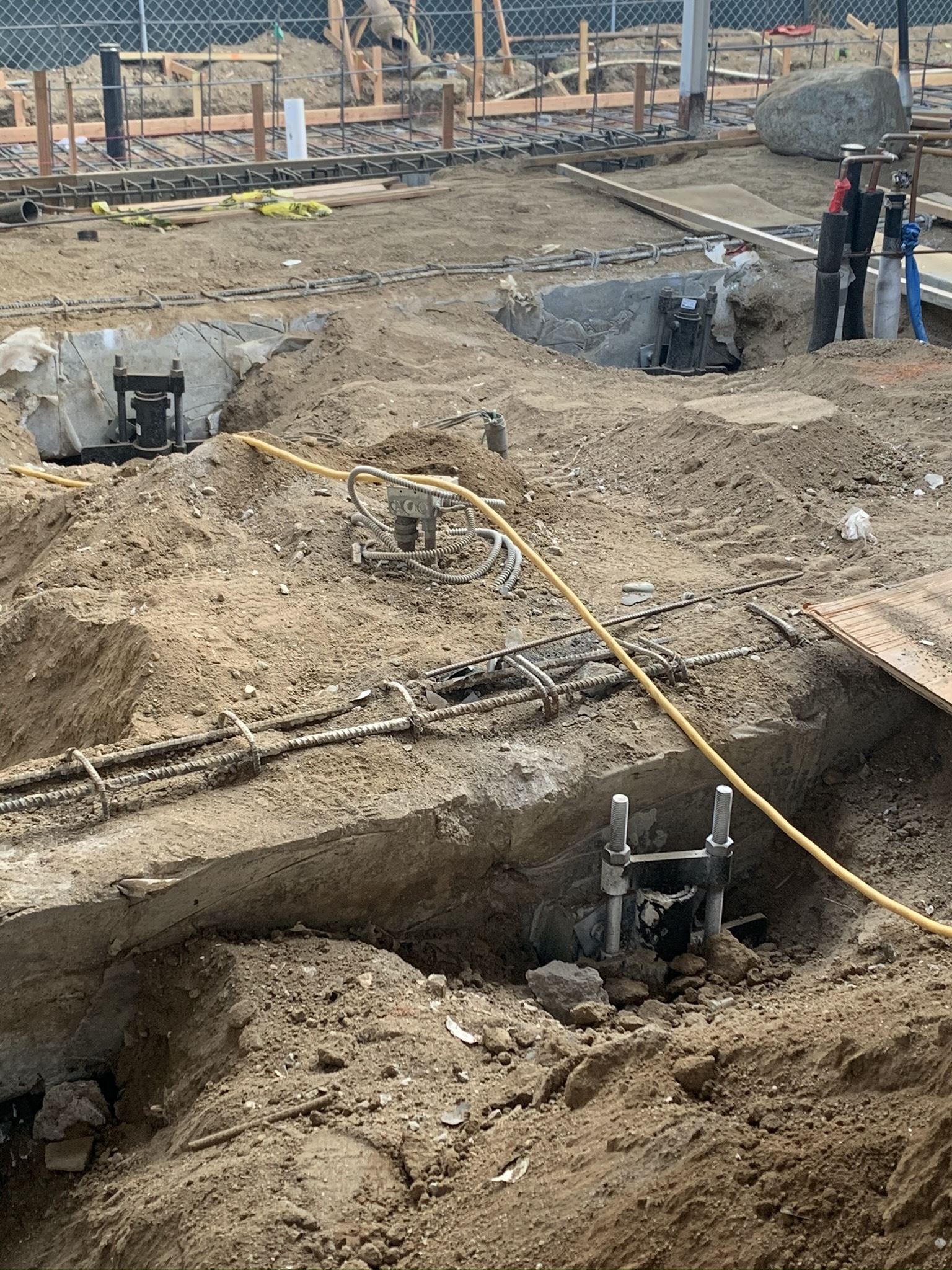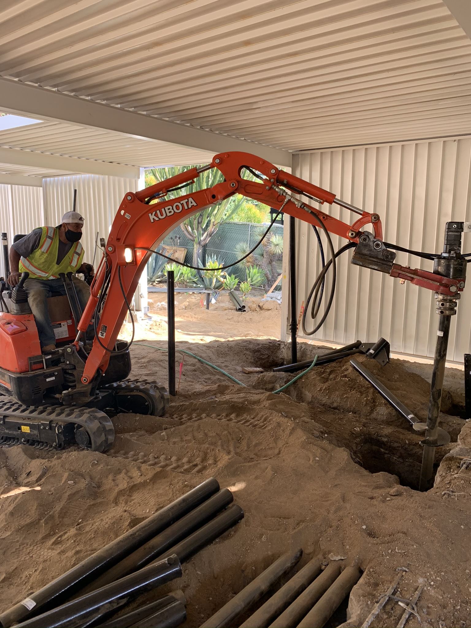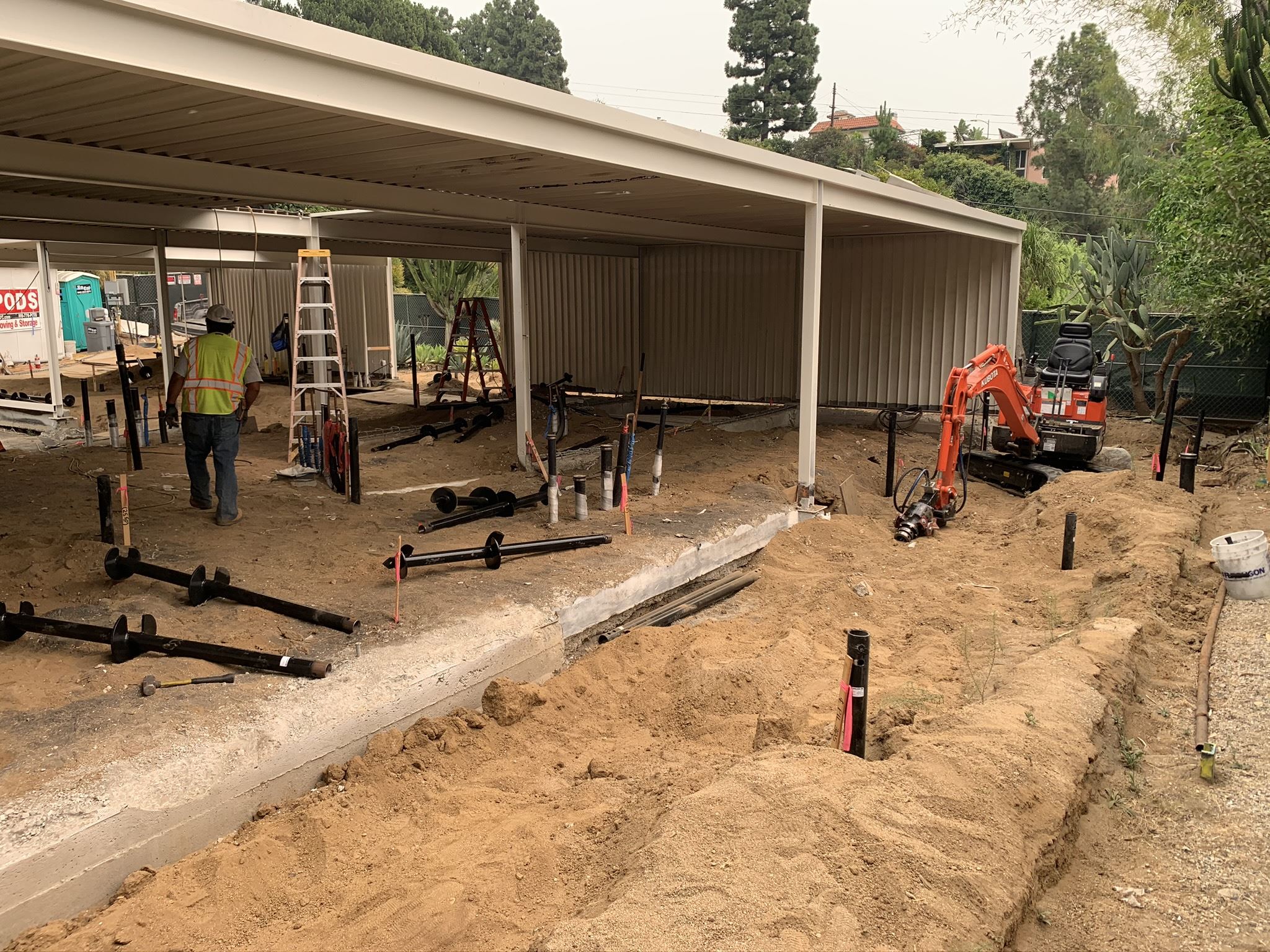 PROPOSED SOLUTION: The design and engineer team designed a grid of Ram Jack Helical Piles on both the interior and exterior. The design was to ensure no additional horizontal movement to the structure over time. Special care would need to be taken when installing the (60) 2 7/8 in. helical piles with 8”-12” double helix configuration as the excavator would have just enough clearance to install the piles without damaging the existing corrugated steel roof or steel beam supports. OUTCOME Ram Jack SoCal installed the piles to specification. On the interior new construction brackets were installed to support the new additional grade beams. On the exterior, new construction brackets were installed to support the newly poured reflective pools. The entire perimeter received side load repair brackets. The project went smoothly and took five weeks to complete.