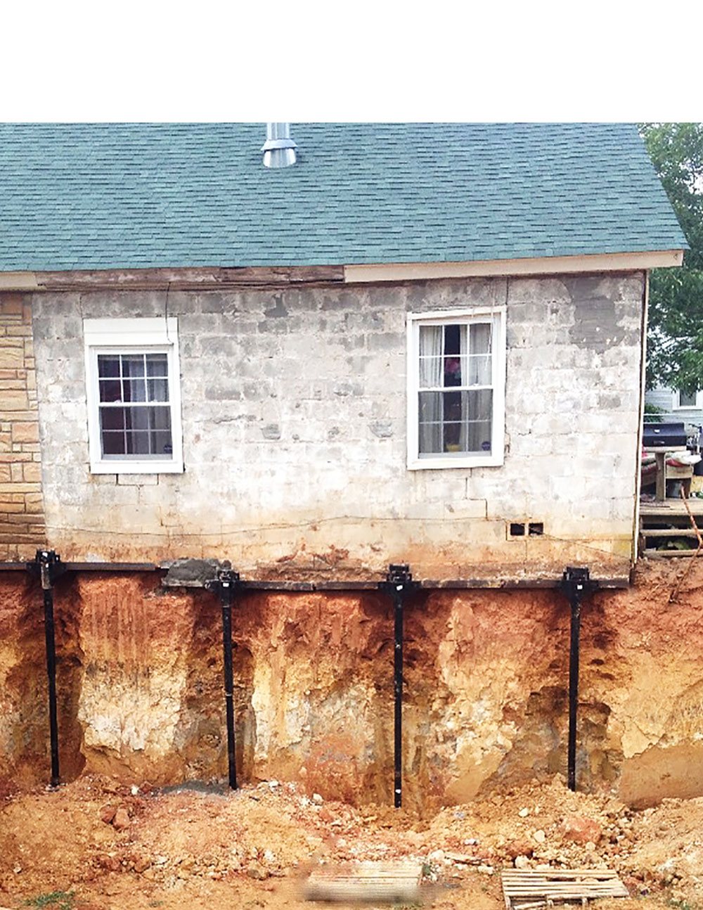 Proposed Solution: Ram Jack proposed the installation of four (4) 2 7/8 in. helical piles with standard brackets and 7 ft. of angle iron between them to support the exterior wall on the previously excavated side of the home. The helical piles would be used to restore the integrity of the structure and provide the needed support in the wall above the compromised area.