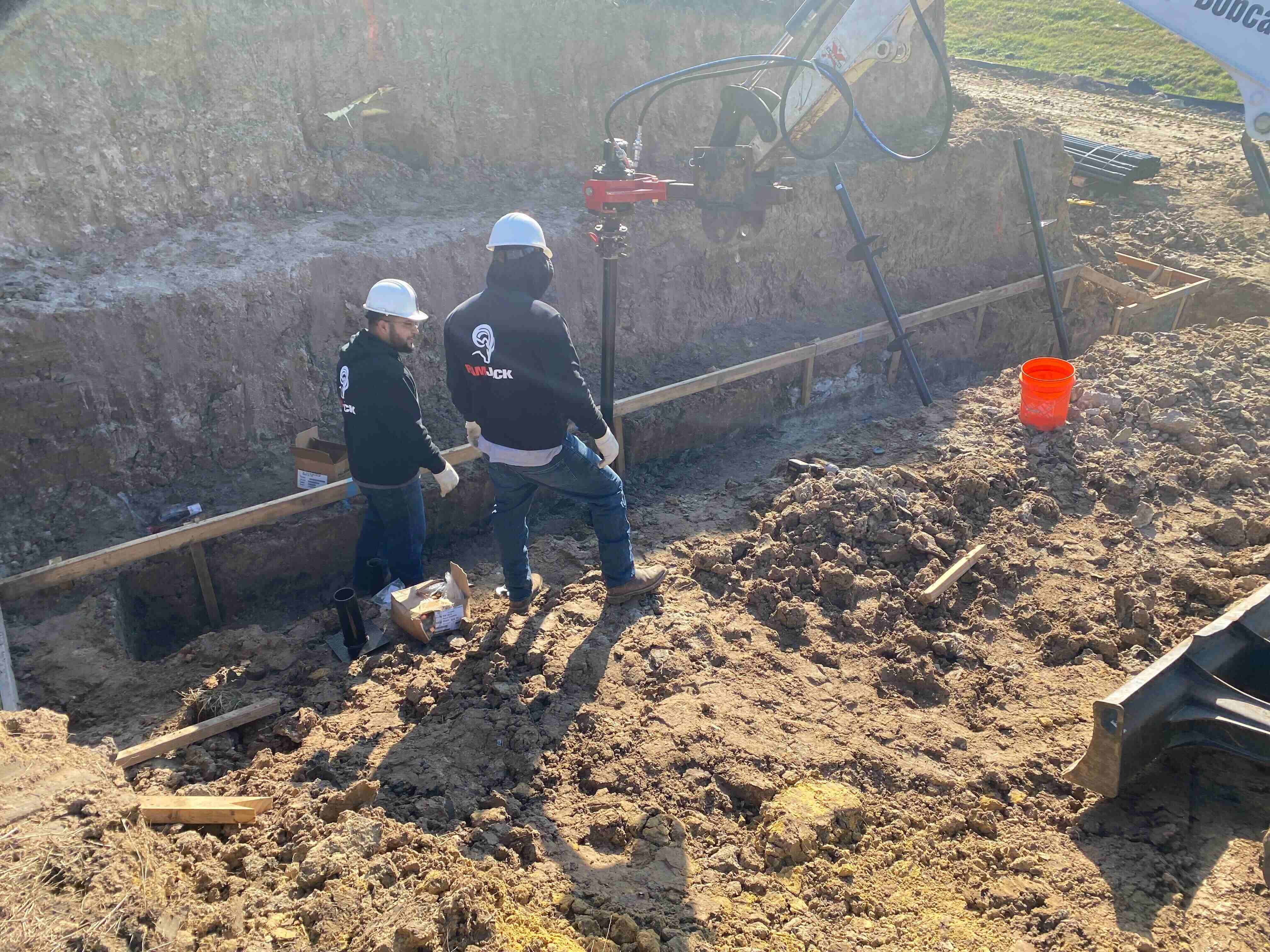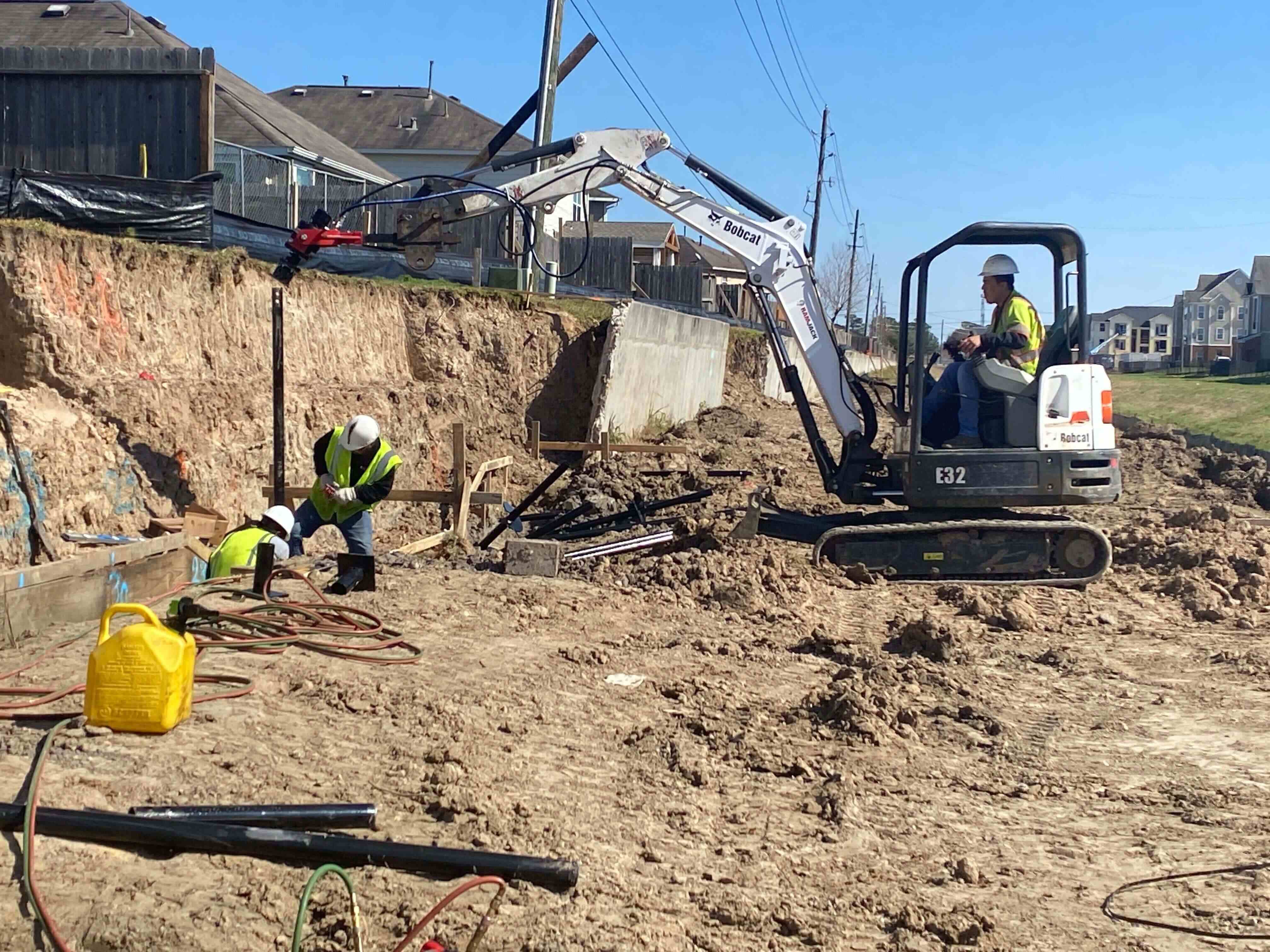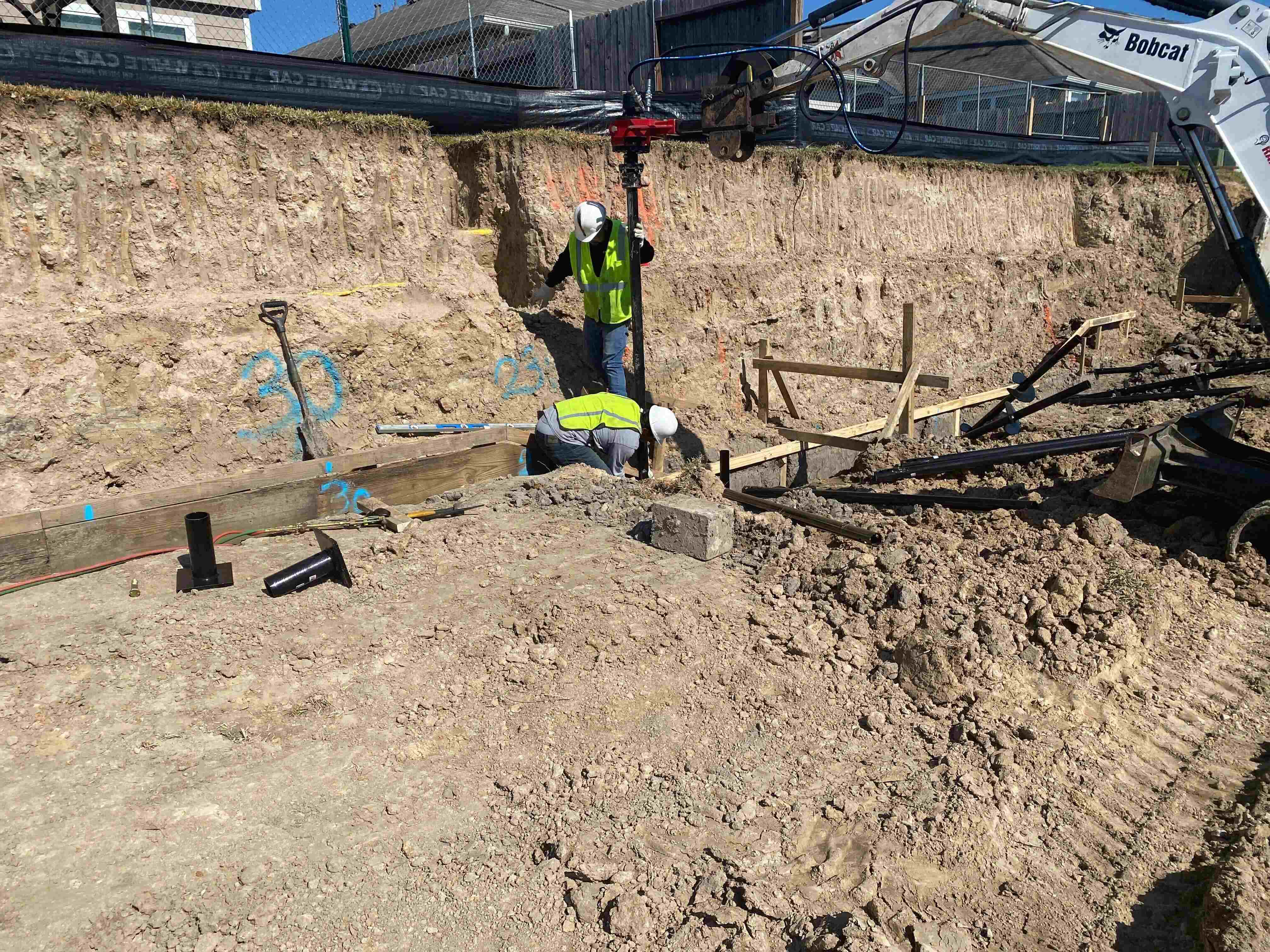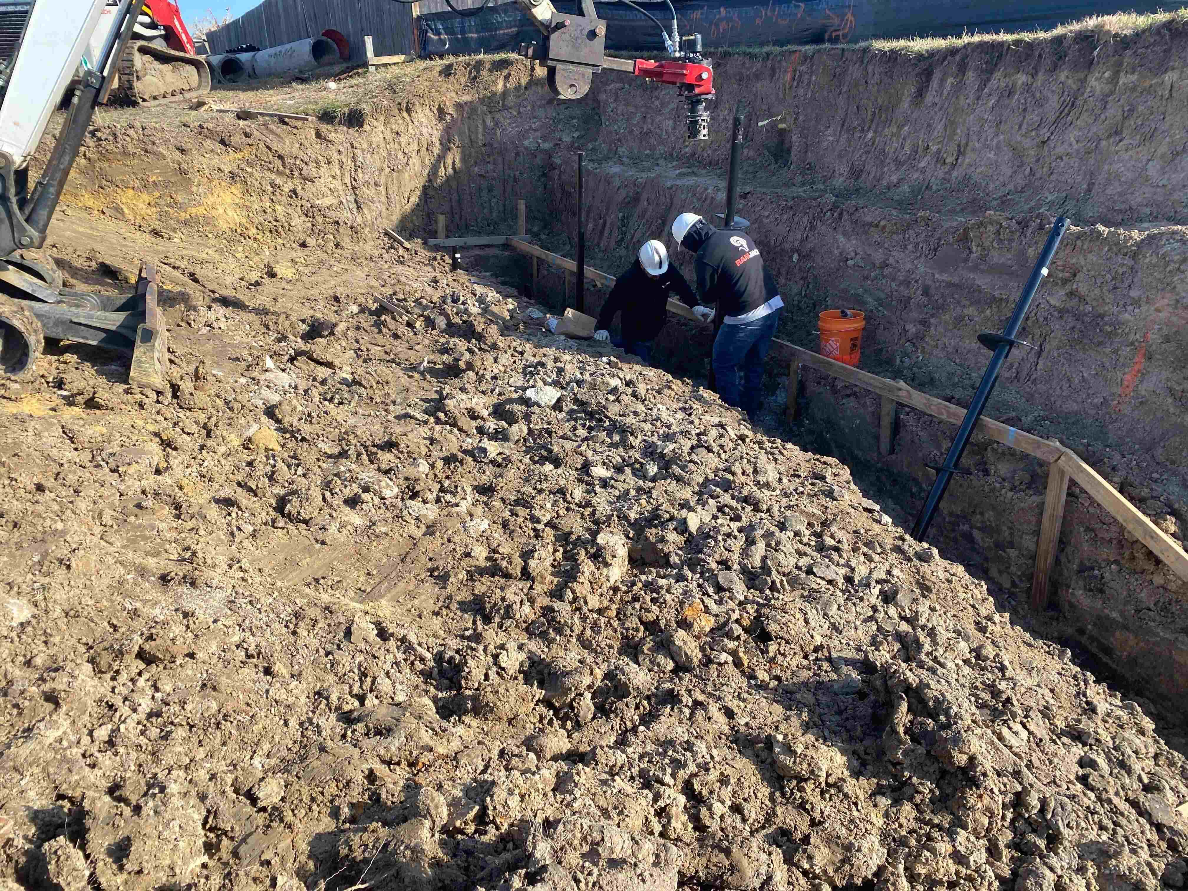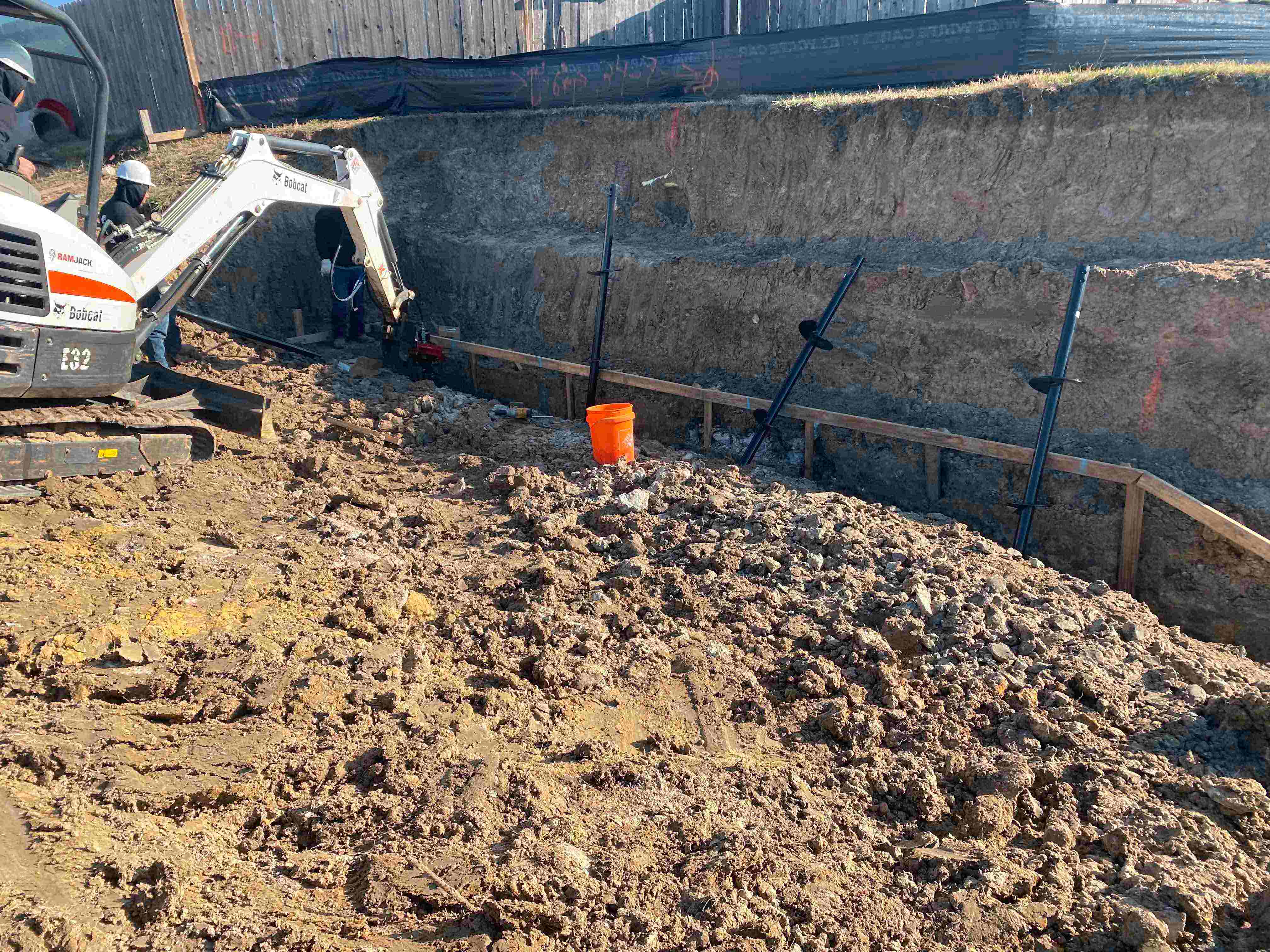 After the design process was completed, the General Contractor on the project started demolition of the existing 750 ft. retaining wall. Buried power lines and utility lines were uncovered right along the face of the proposed wall at the time of installation. Consequently, the installation angle of some of the tiebacks were revised accordingly to avoid these obstructions in the field. Ram Jack installed (110) vertical 2 7/8” New Construction piles at a depth of 30’, (56) 30-degree 2 7/8” Tie-Backs at 33’, (117) 45-degree 2 7/8” tiebacks at 25’. Ram Jack worked with the General Contractors' schedule to complete the project. During the installation, Ram Jack fought rainy conditions and still finished the project early and within budget.