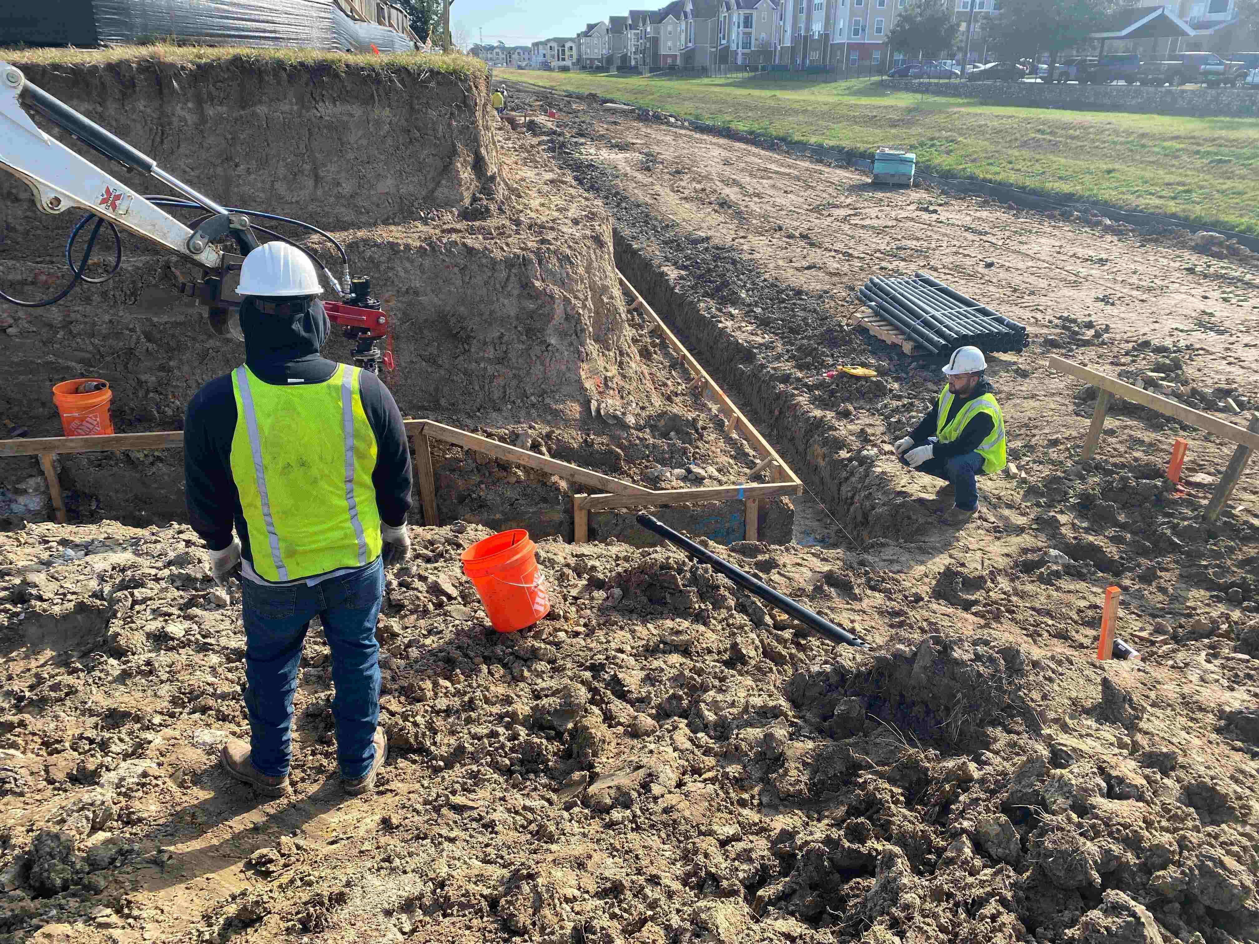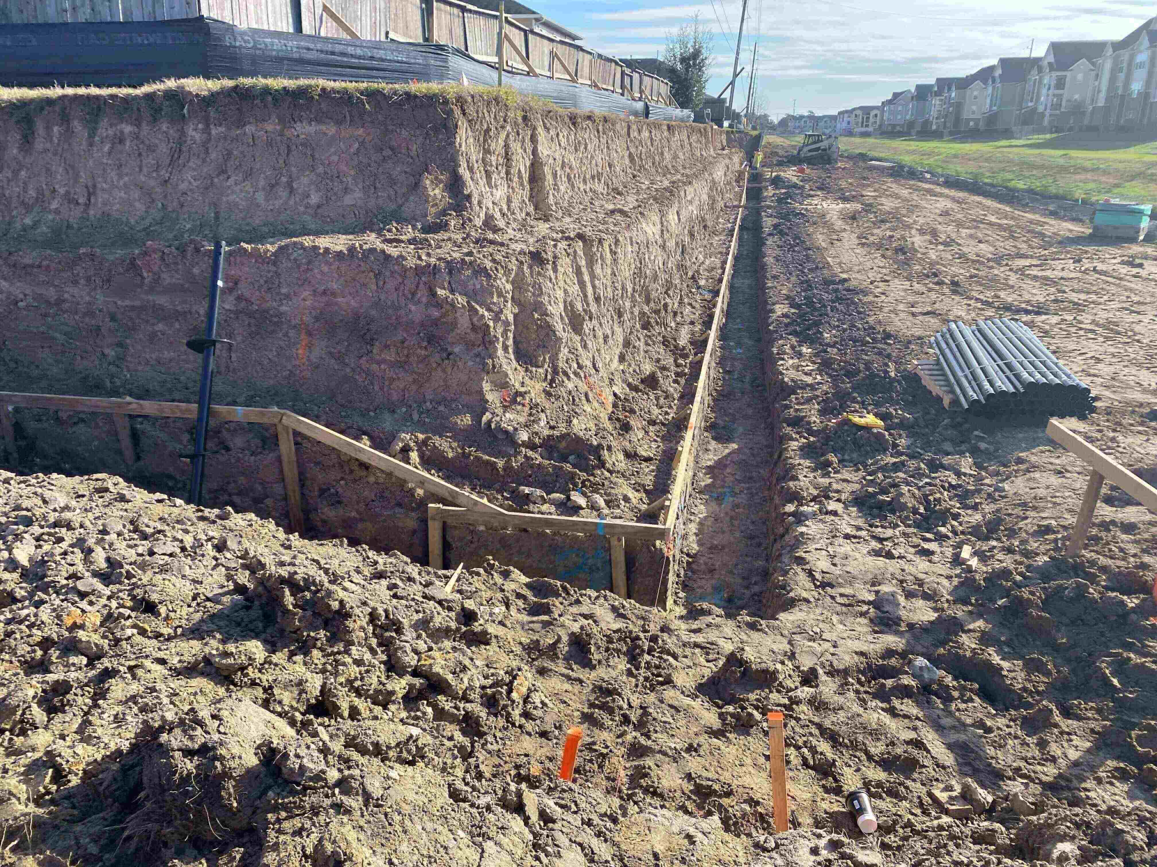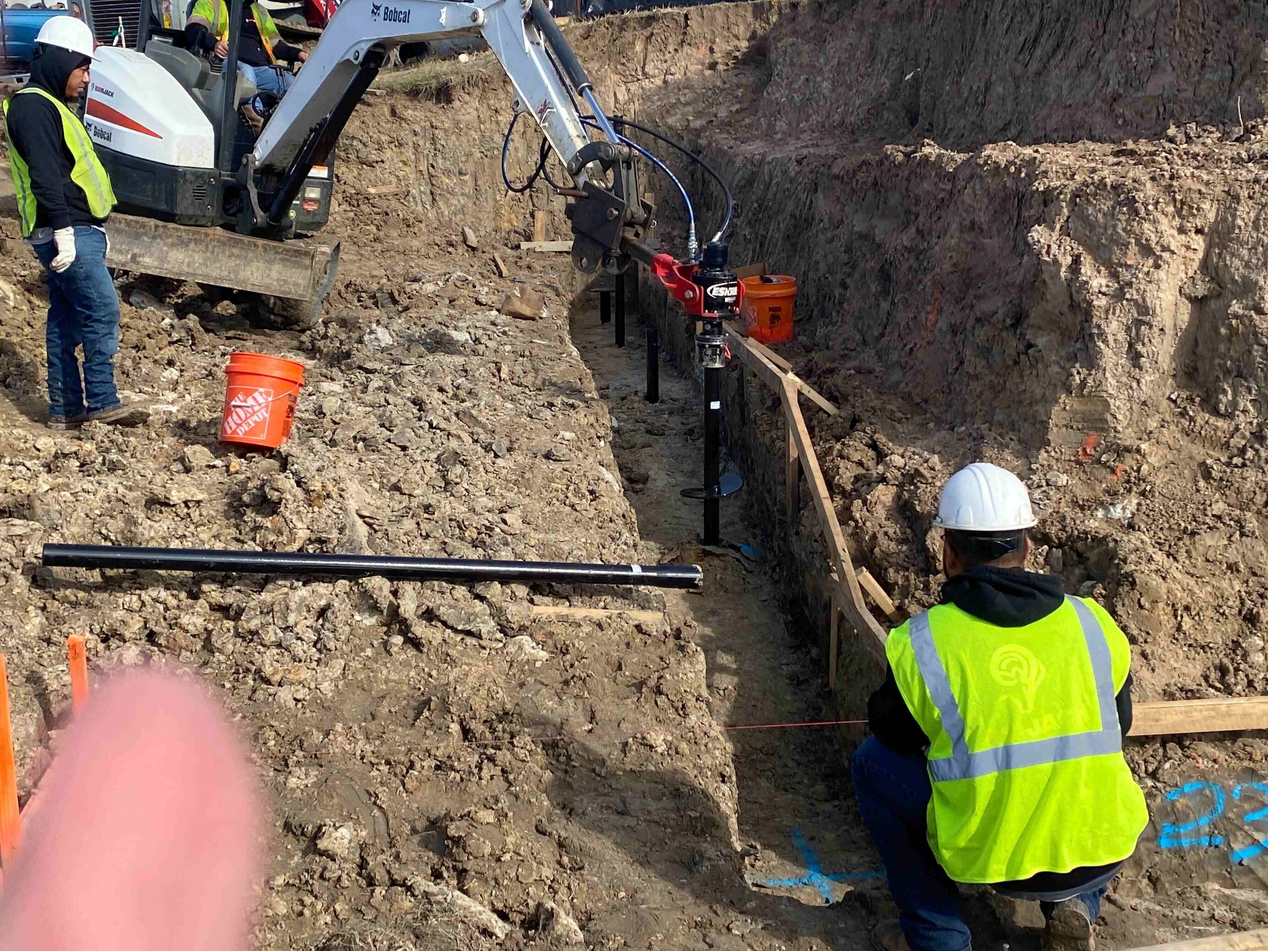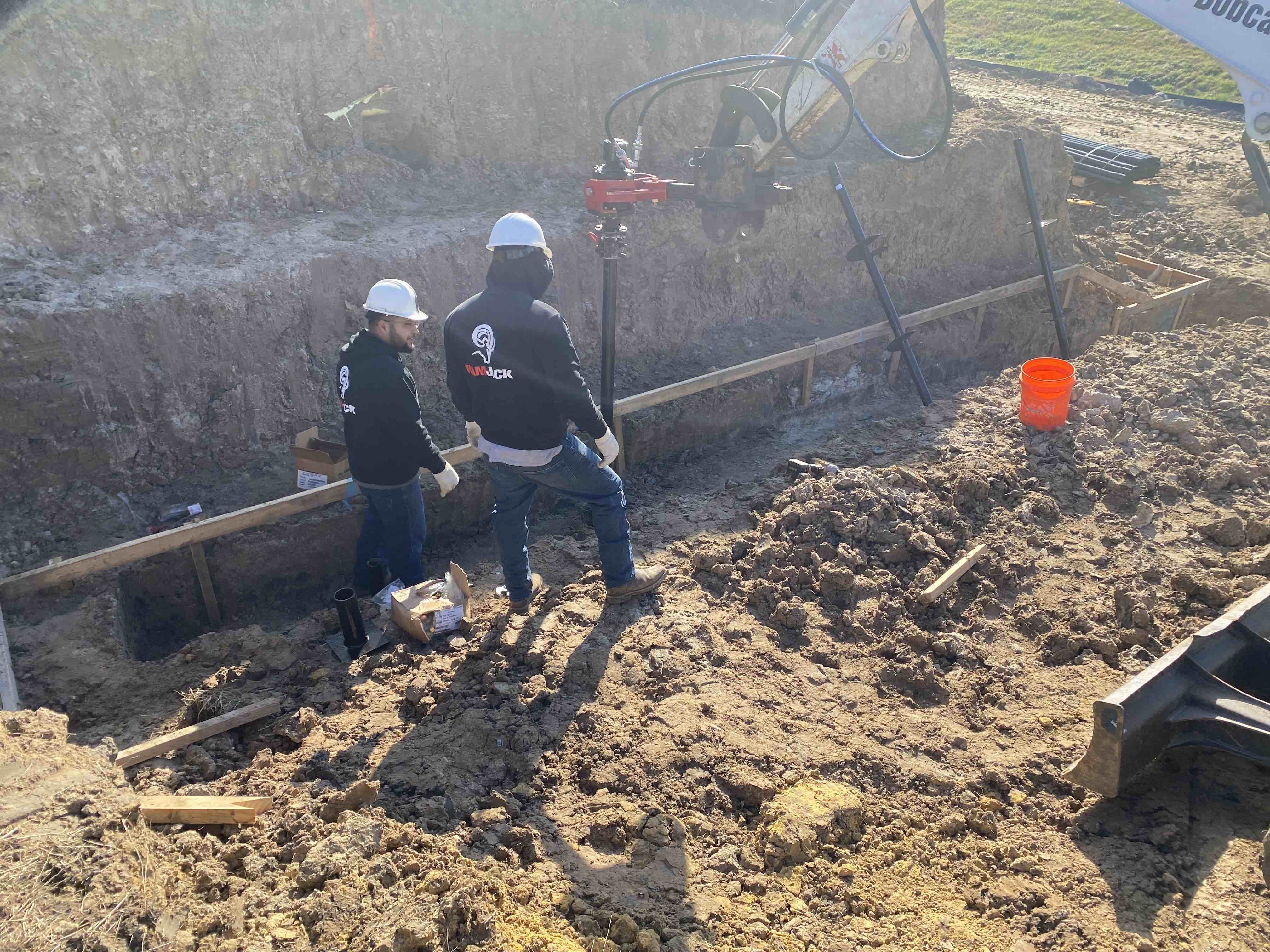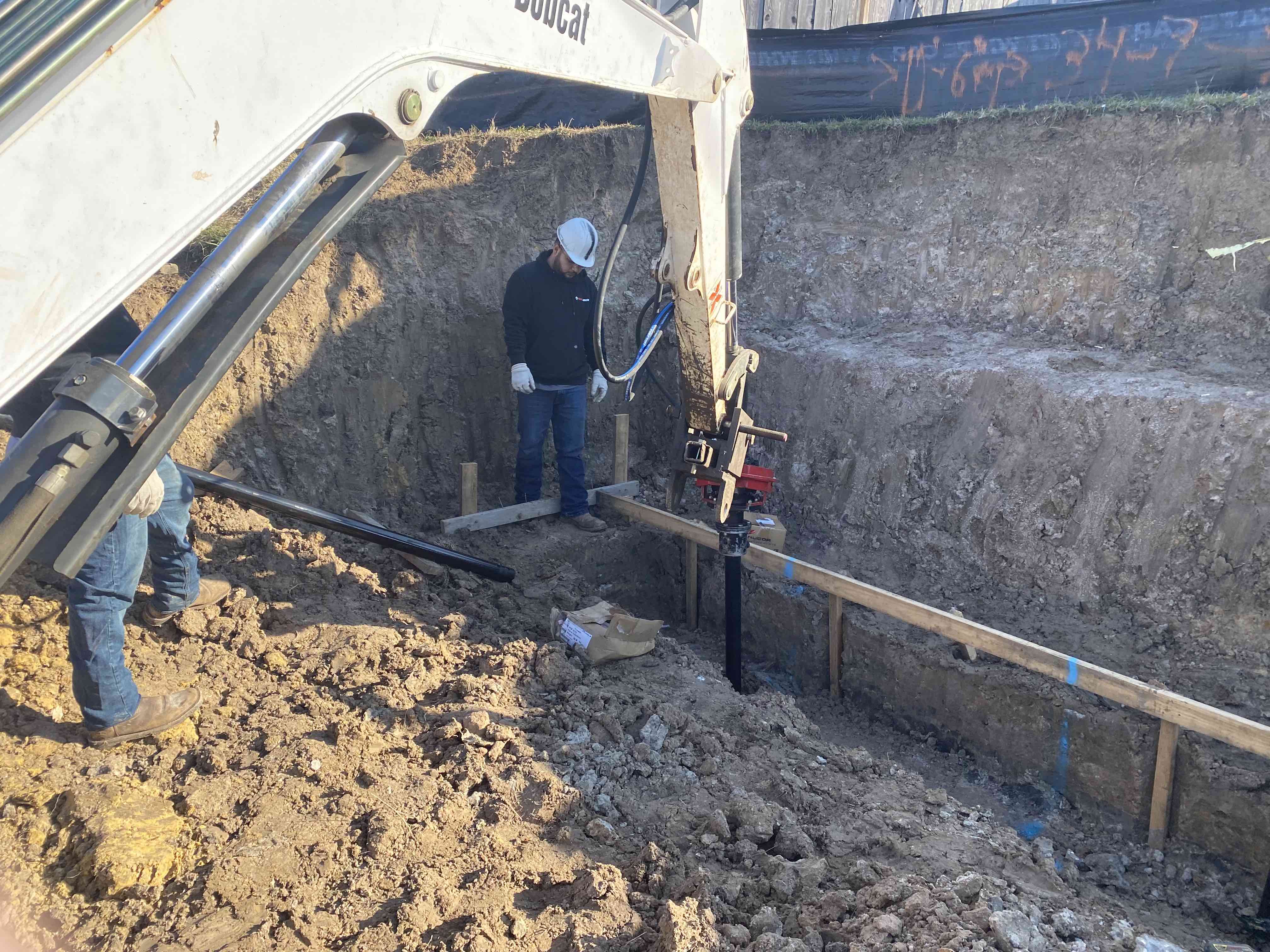 After the design process was completed, the General Contractor on the project started demolition of the existing 750 ft. retaining wall. Buried power lines and utility lines were uncovered right along the face of the proposed wall at the time of installation. Consequently, the installation angle of some of the tiebacks were revised accordingly to avoid these obstructions in the field. Ram Jack installed (110) vertical 2 7/8” New Construction piles at a depth of 30’, (56) 30-degree 2 7/8” Tie-Backs at 33’, (117) 45-degree 2 7/8” tiebacks at 25’. Ram Jack worked with the General Contractors' schedule to complete the project. During the installation, Ram Jack fought rainy conditions and still finished the project early and within budget.