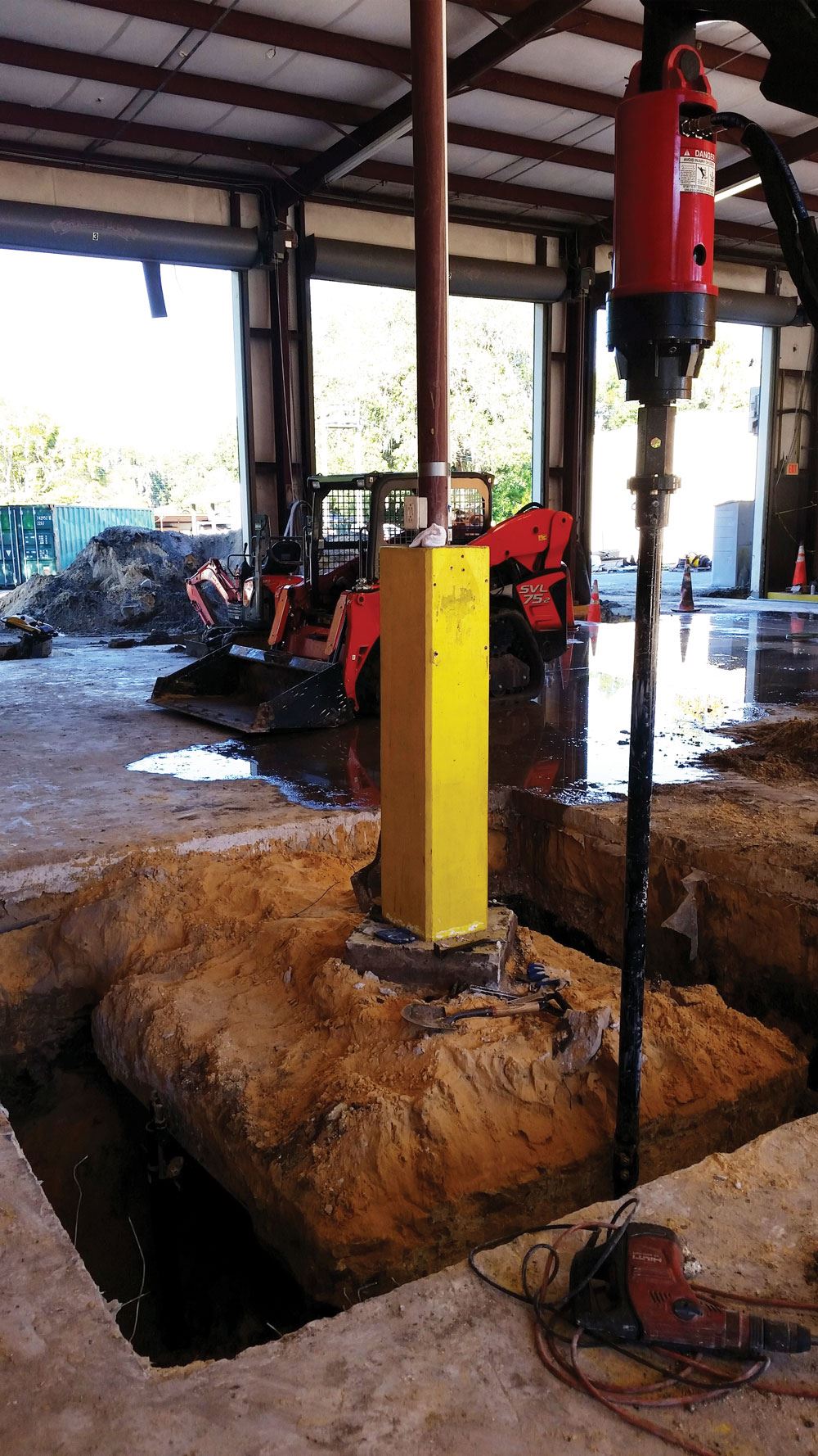 Proposed Solution: Ram Jack Solid Foundations proposed the use of remediation helical piles to support the foundation in combination with placed grout to stabilize the ground below. By using helical piles, the amount of grout needed would be reduced to 40 cubic yards, and the nearby well would not be threatened. The helical piles would support the perimeter, interior, engine bays, and column footers; and the interior would be further supported by a newly placed slab to replace the damaged one.