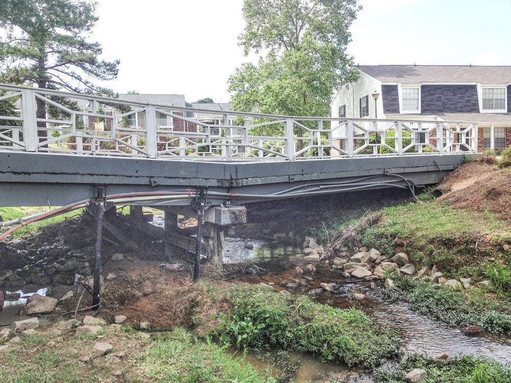A bridge supported by driven wood piles, connecting two sections of an apartment complex designed for vehicles, crosses a 20 ft. wide creek. The fire marshal had been monitoring the bridge for several years to ensure emergency vehicles could use the bridge safely. The settlement of the bridge was deemed unsafe; if the bridge wasn’t repaired, the apartments would be condemned.