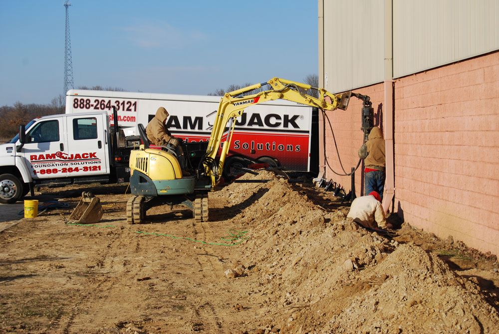Situation: October 2008, Windsor Forestry Tools, a local industrial facility in Milan, TN, contacted Ram Jack of Tennessee with some foundation issues they were having with their building. During the site inspection, large cracks were observed in the perimeter wall that allowed sunlight to be seen from inside the building through the cracks. An elevation survey determined the perimeter foundation and floor slab had settled three (3”) inches. The owners required that any underpinning work that was required have minimal to no effect on the facility's daily operations.